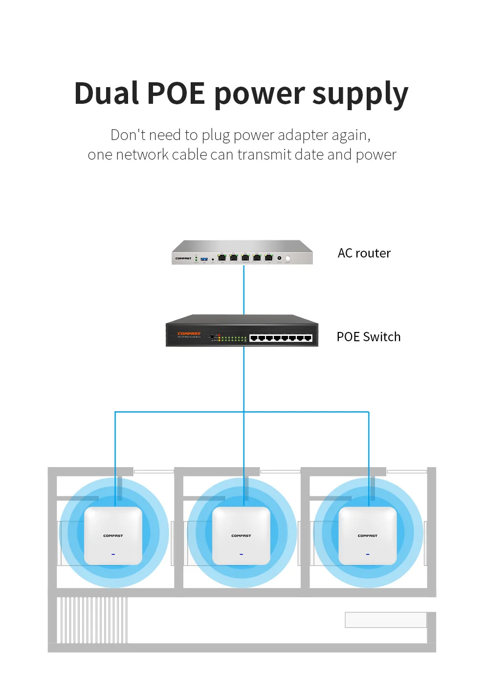 It's matched with COMFAST AC management device which can unified management and automatically configure of large quantity of wireless ceiling AP simultaneously