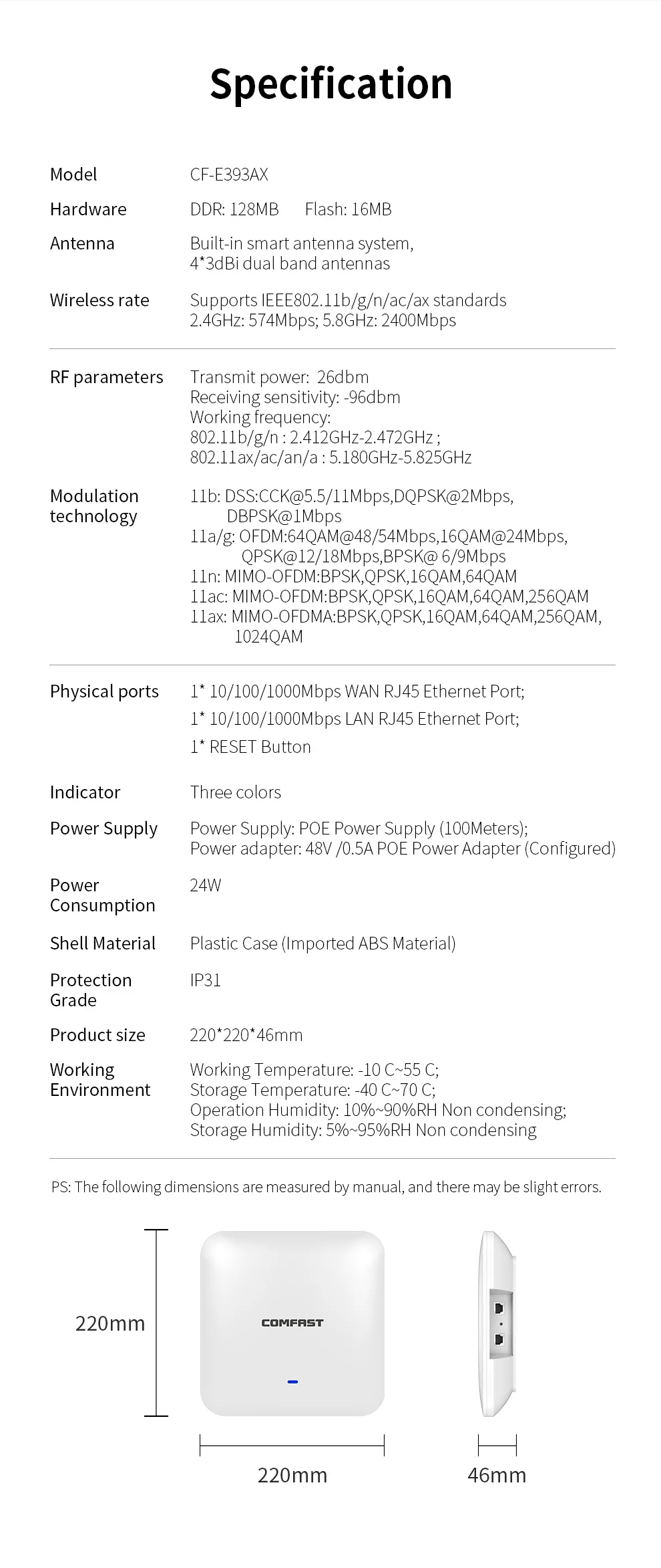 Support WiFi 6 standard, Strong 3 cores, Full Gigabit Ports, 2.4G&5GHz Dual band, POE power supply, OFDMA technology, Support 220+ Users, Centralized management, Seamless Roaming.