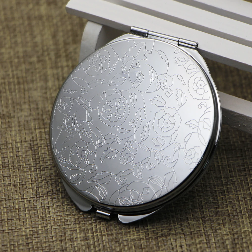 Included in this set round shaped thin silver compact mirror which opens up to 1 regular mirror and the 2x magnifying mirror