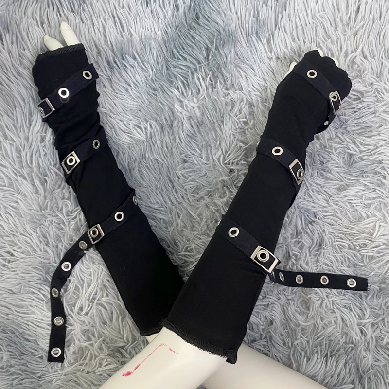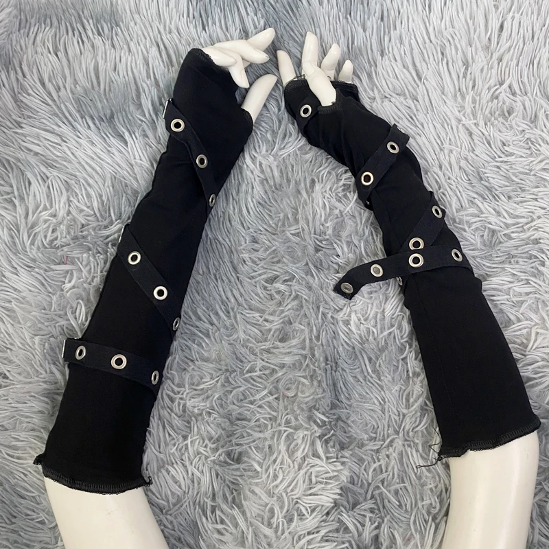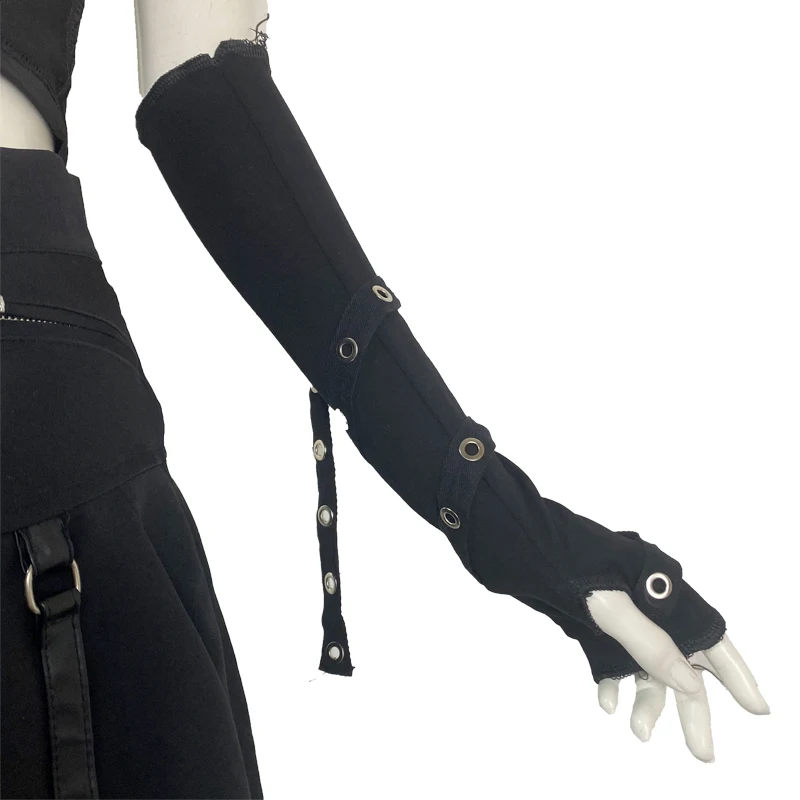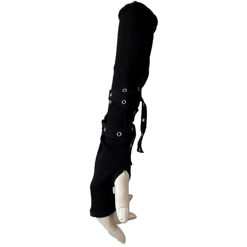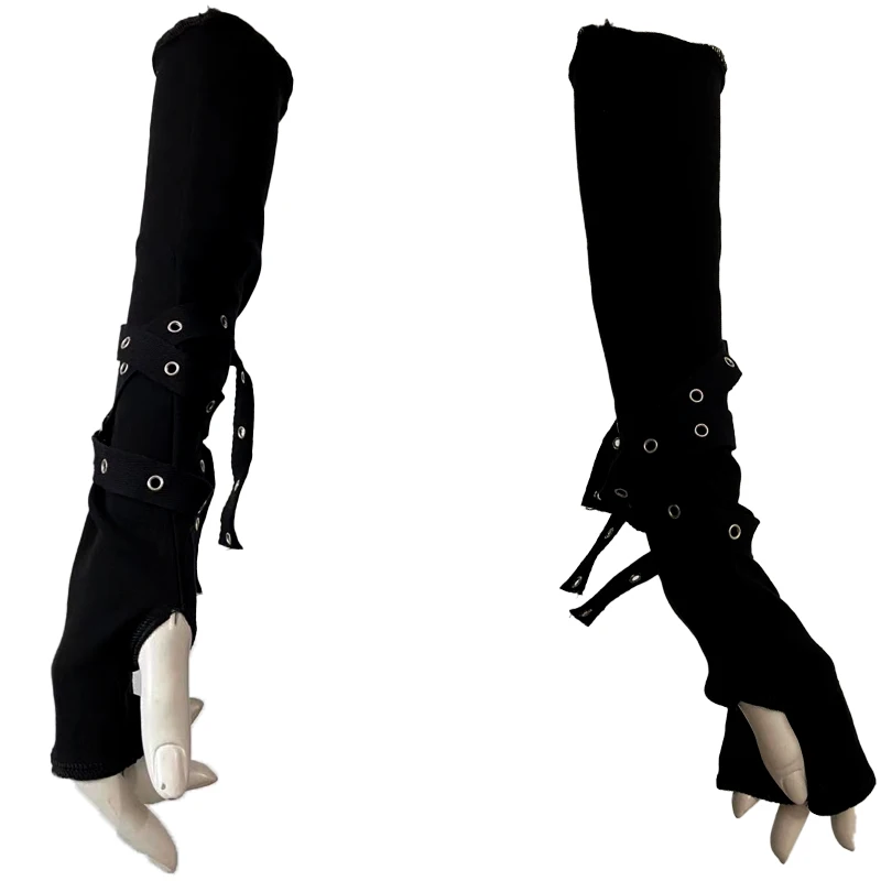 Dark Goth Eyelet Ribbon Cool Girl Man Elbow Length Outsleeve Gloves Black Gothic Unisex Punk Fingerless Glove Harajuku Mittens