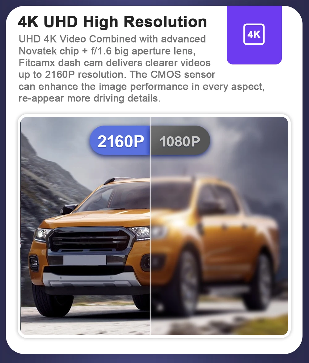 UHD 4K Video Combined with advanced Novatek chip + f/1.6 big aperture lens, Fitcamx dash cam delivers clearer videos up to 2160P resolution. The CMOS sensor can enhance the image performance in every aspect, re-appear more driving details.