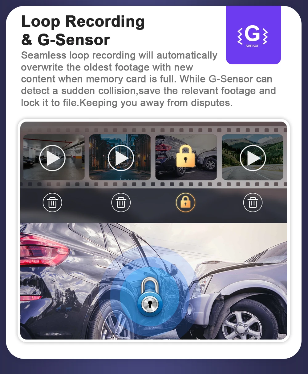 Seamless loop recording will automatically overwrite the oldest footage with new content when memory card is full. While G-Sensor can detect a sudden collision,save the relevant footage and lock it to file. Keeping you away from disputes.