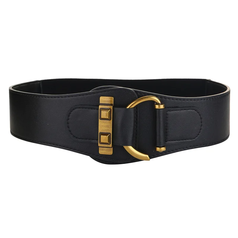 Title: Real Leather Wide Belts Classic Golden Buckle Elastic Waistband Trendy Solid Color Dress Coat Girdle For Women