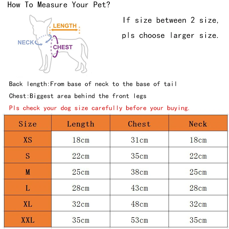 Note:Plssizing your dog before buyingwill help get you the right products!Pls kindly read the measurements,size XS/S/M/L/XL/XXL May not be the same for different clothes.
