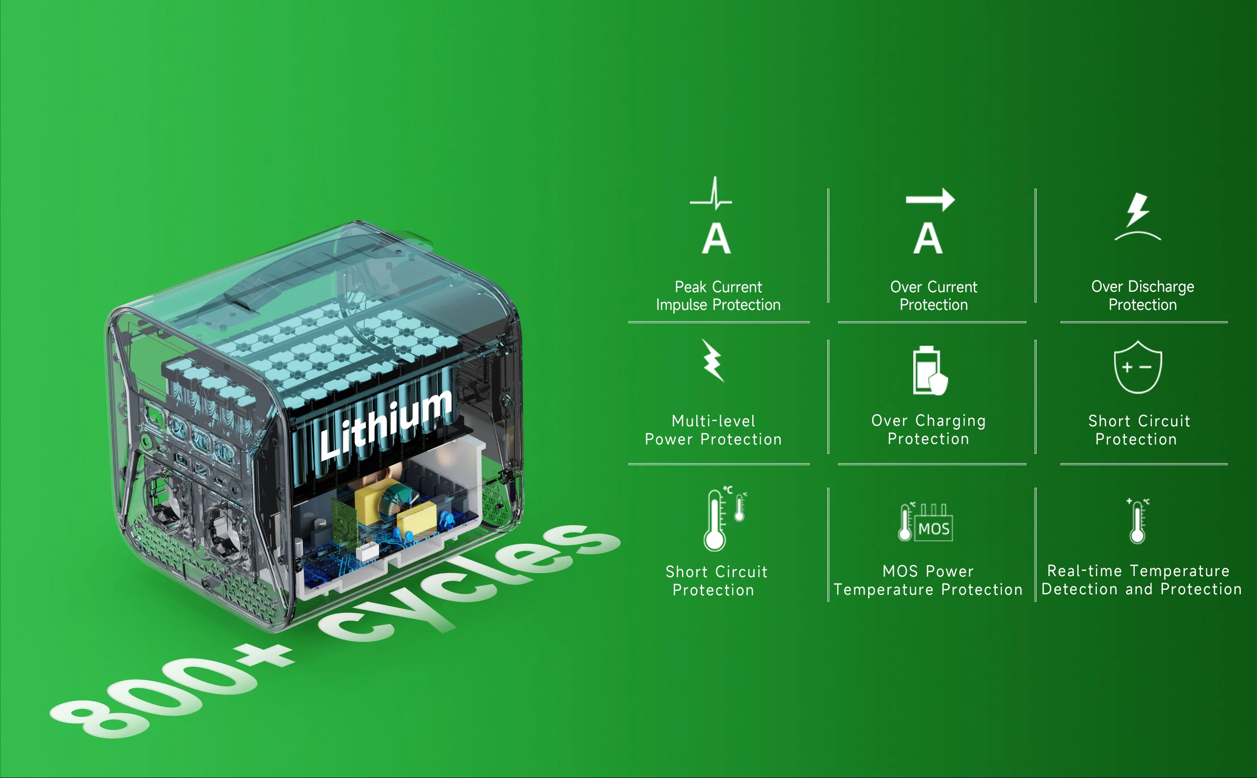 The all powers power station comes with the Battery Management System (BMS), which allows for voltage control, temperature control and more advanced safety operations, keeping your battery running for years.