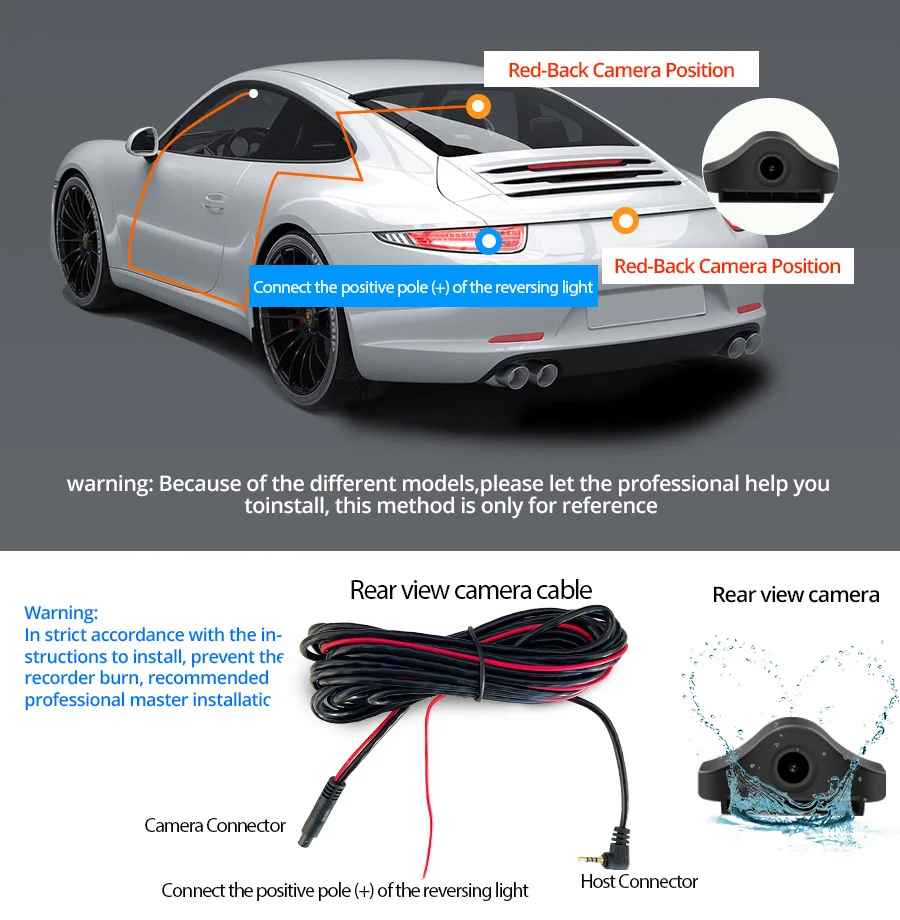 Please connect the rear camera's Red cable wire with your car reverse lamp power's Positive pole(+).