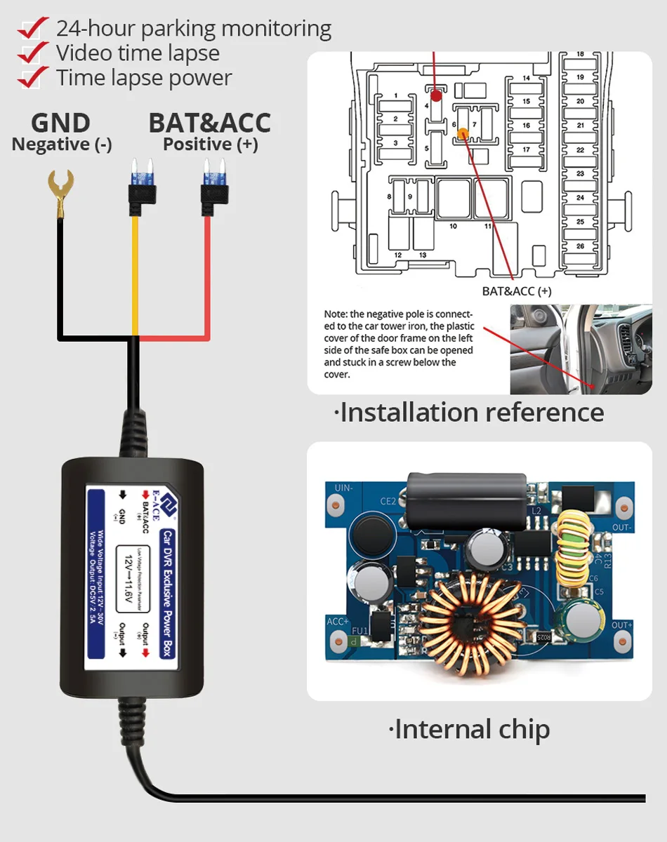 If you want to stop monitoring after parking (the DVR does not work after parking), connect the positive pole of the buck line to the fuse box ACC interface.