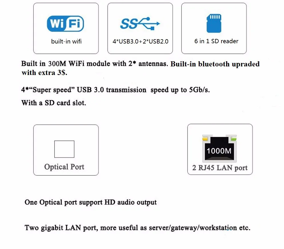 front panel ports | 1* Power indicator and switch, 4*USB3.0, 1*Opticd, 1*SD Card Reader, 1*MIC, 1*SPK |