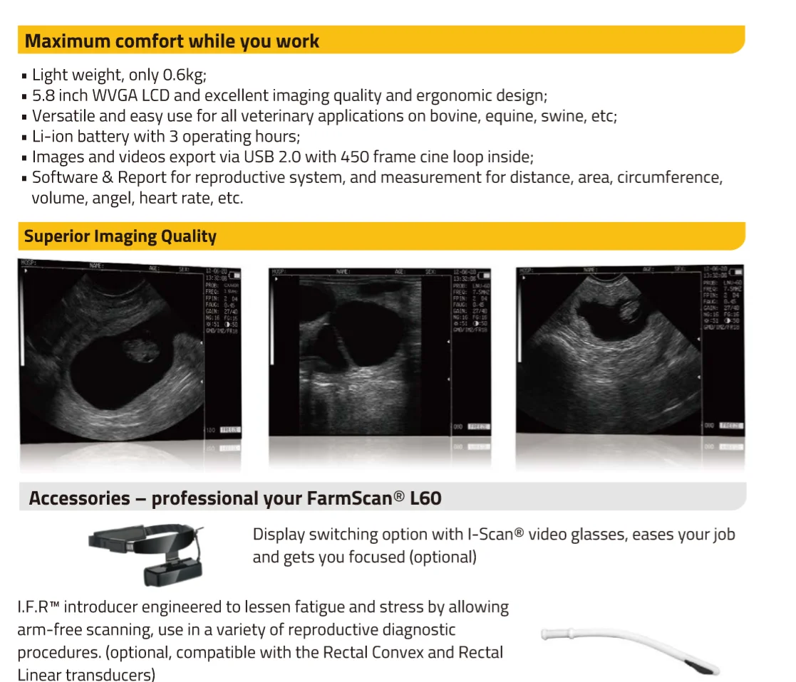 FarmScan® L60, featuring premium image quality, considerate design for comfortable, fast and reliable detection of pregancy and gynecological diagnosic in difficlult field conditions on a dairly basis.