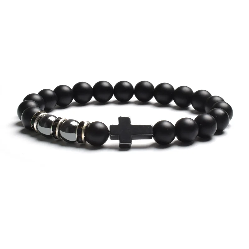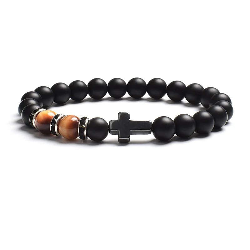 Fashion Religion Cross Men Women 8mm Natural Stone Tiger Eye & Black Matte Agates Bead Bracelet Elastic Bracelet Bangle Jewelry