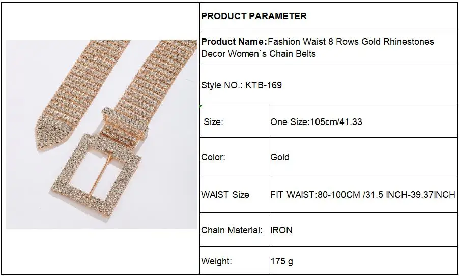 Description Description Fashion Waist 8 Rows Gold Rhinestones Decor Women`s Chain Belts View AllClose