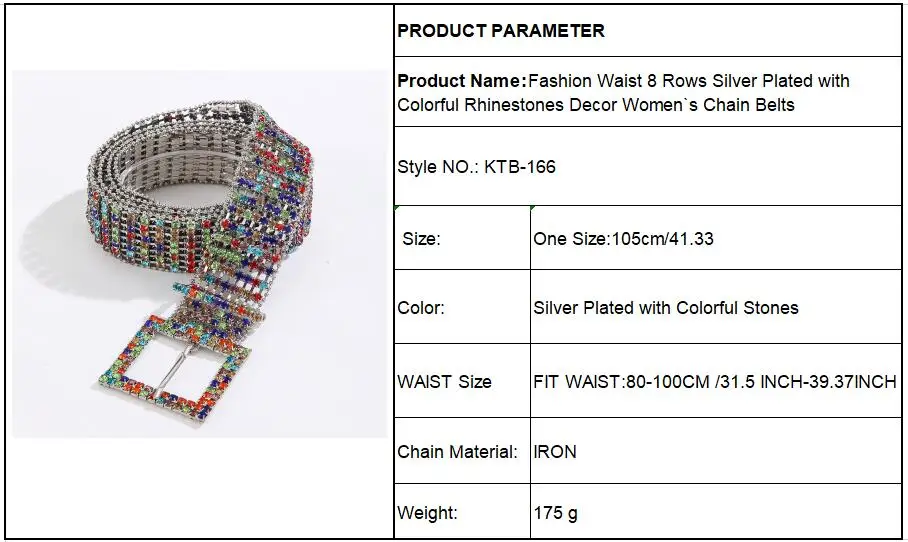 Description Description Fashion Waist 8 Rows Silver Plated with Colorful Rhinestones Decor Women`s Chain Belts View AllClose