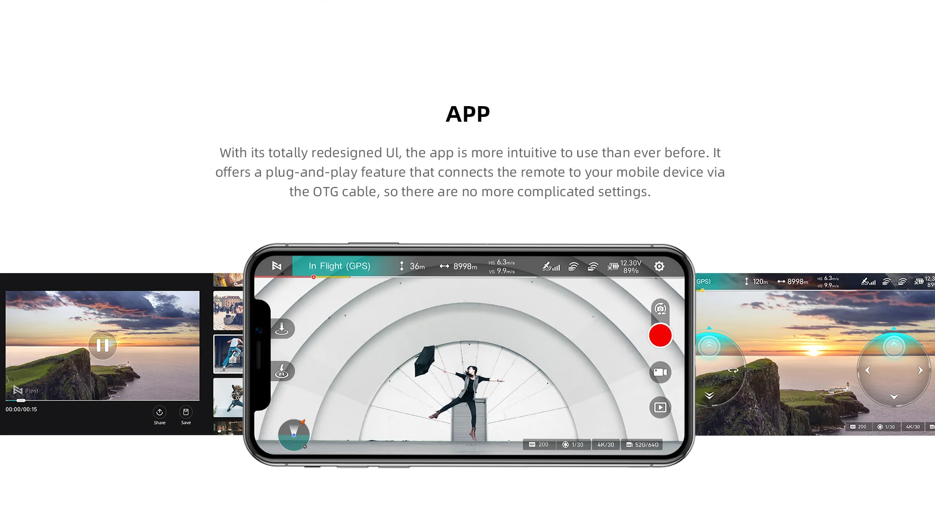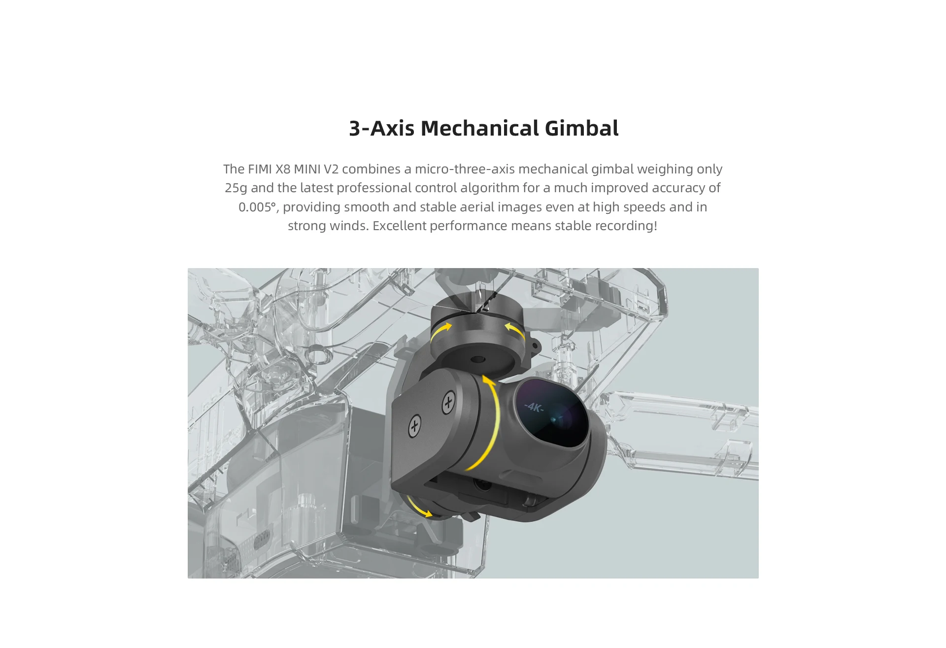 2. 3-axis Mechanical Gimbal: The 3rd generation of the LOS stabilization alogrithm,a sensor with high precision control and an accuracy of 0.005 °,and a fully closed-loop servo system all contribute to perfect eliminating jitters in real time,allowing you to enjoy silky smoothness in your blockbusters.