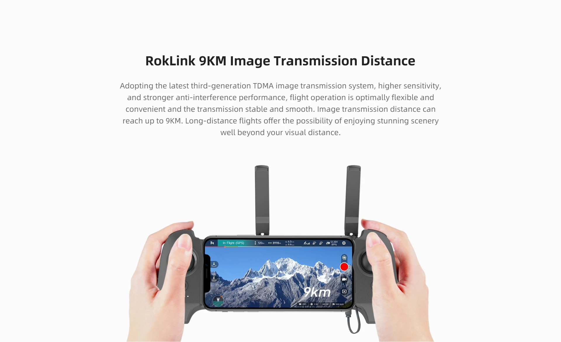 5. 10KM Range: the upgraded 3rd generation RokLink high-definition digital image transmission system with adaptive stream-encoding technology Provides a superior transmission distance of up to 10km.