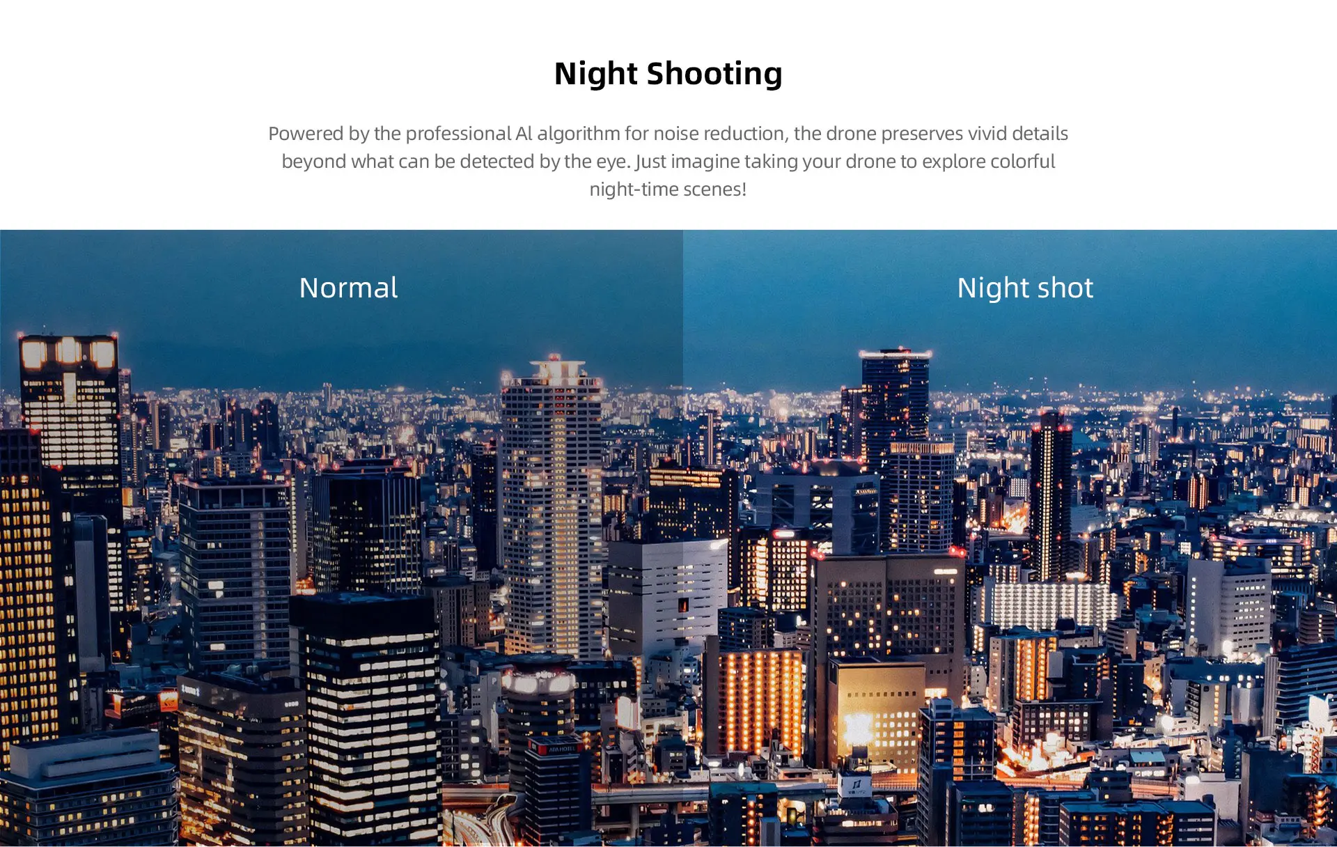 3. Night Shot: based on multi-frame fusion noise reduction technology and the large aperture of the 1/2 ''sensor,you can take your drone with you to capture the beauty of night.