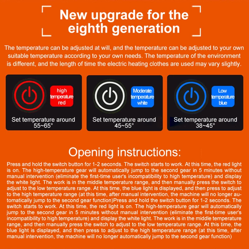 On-Press and hold the on / off button for three seconds. The initial temperature is 50 degrees (red LED), the intermediate temperature is 45degrees (white LED), and the lowest 35 degrees (blue LED).