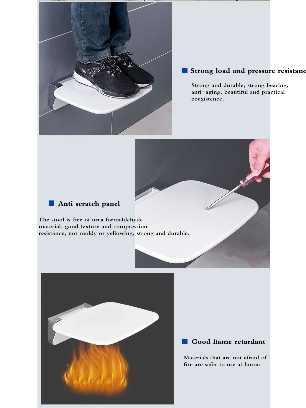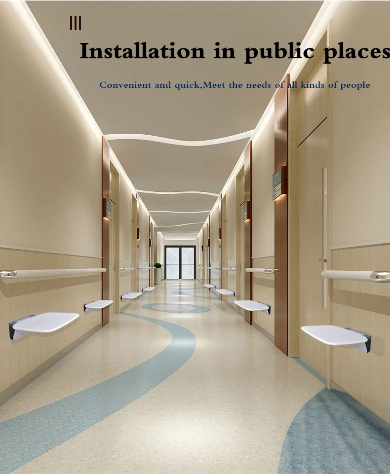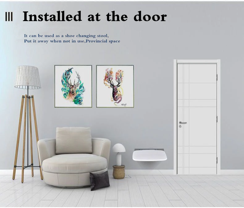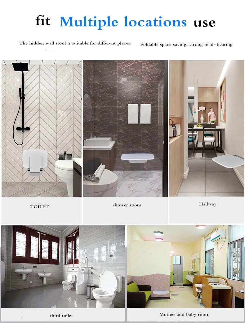 1.Installed in public places: convenient and fast, it can meet the needs of various groups of people. 2.Installed in bathroom:Suitable for the elderly, pregnant women, not long standing crowd. 3.Installed at the door:It can be used as a shoe changing stool and can be folded up when not in use, saving space. 4.Ultra thin, can be hidden behind the door:Humanized design, can be installed at the door to use, to meet the inconvenience of changing shoes at the door! Completely hidden behind the door.