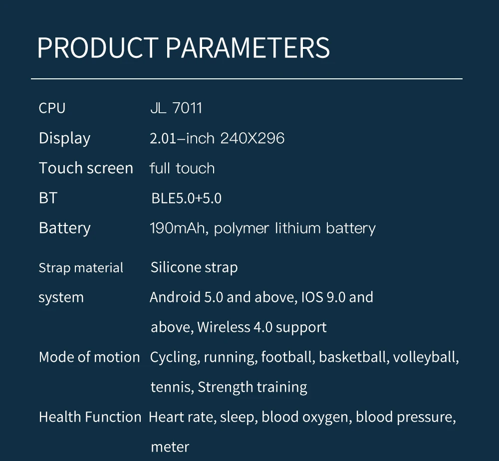 ●Sport modes:Cycling, skipping rope, walking, climbing.Message.