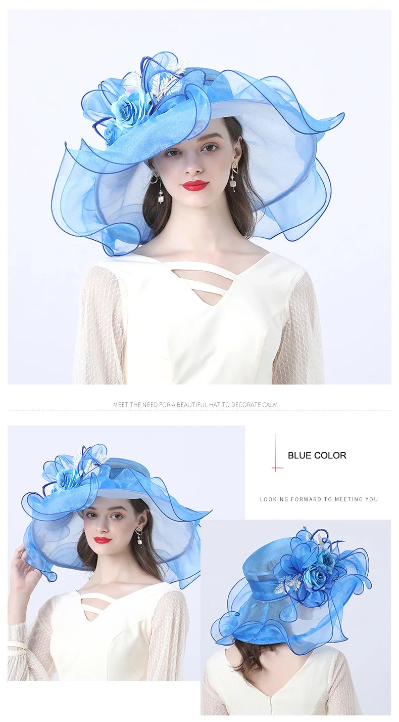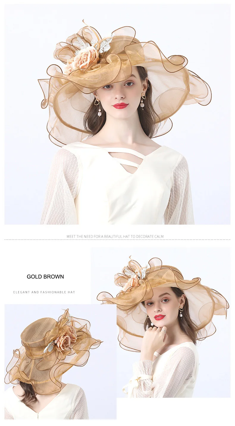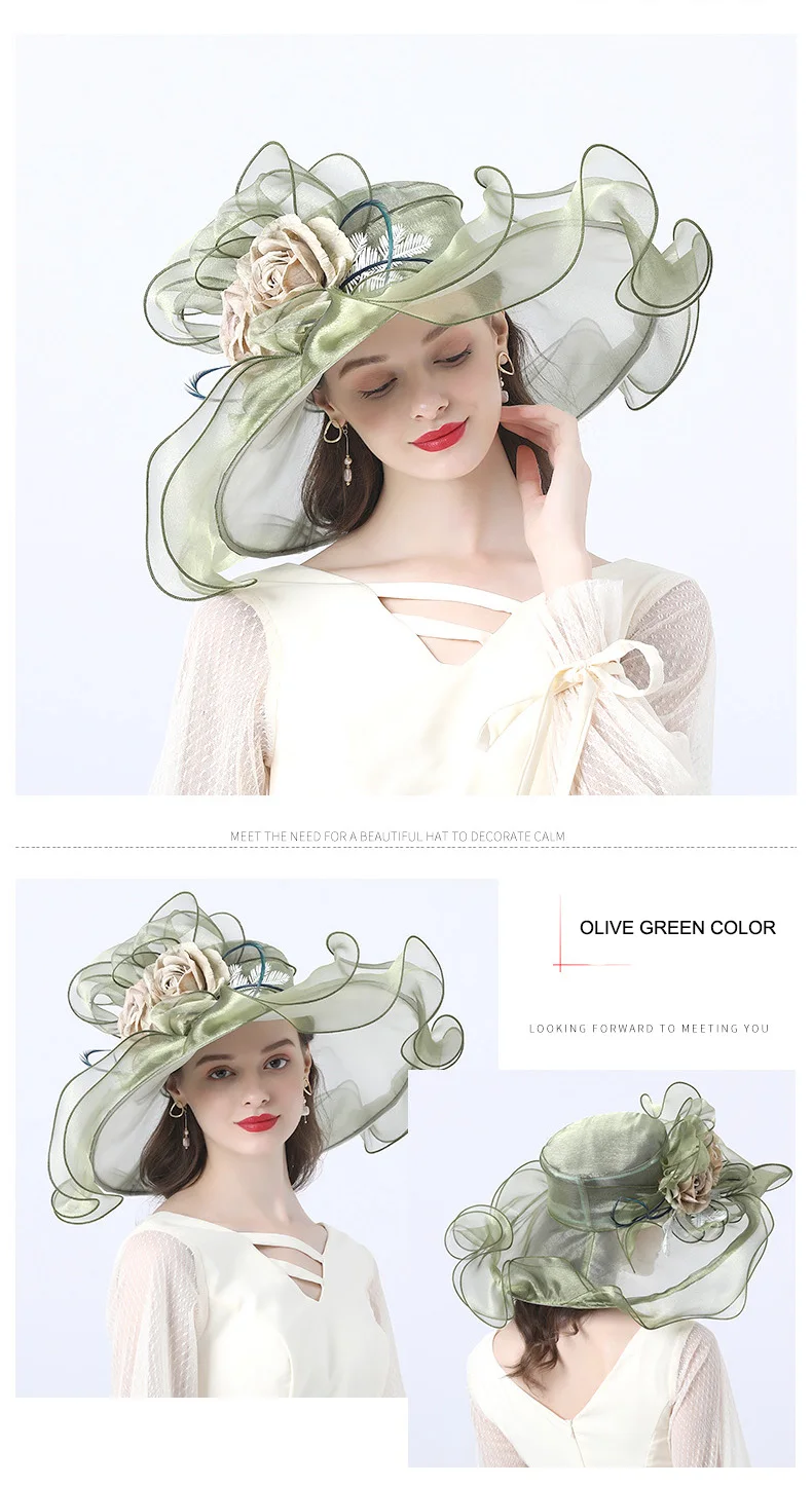 FS Flower Fascinator Women Kentucky Derby Wide Brim Wedding Church Organza Sun Hat 2021 Elegant Summer Large Ladies Fedoras