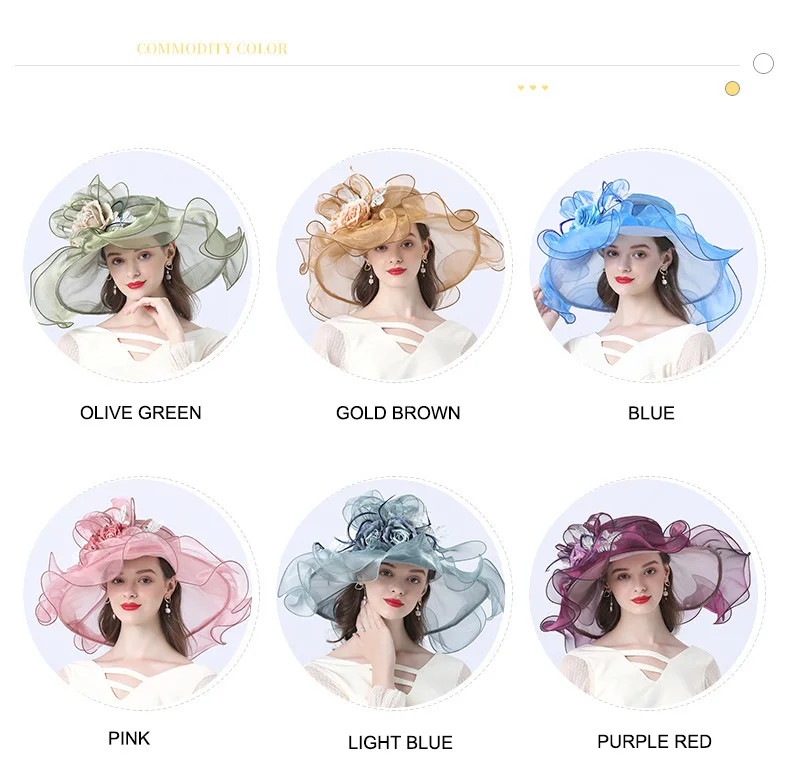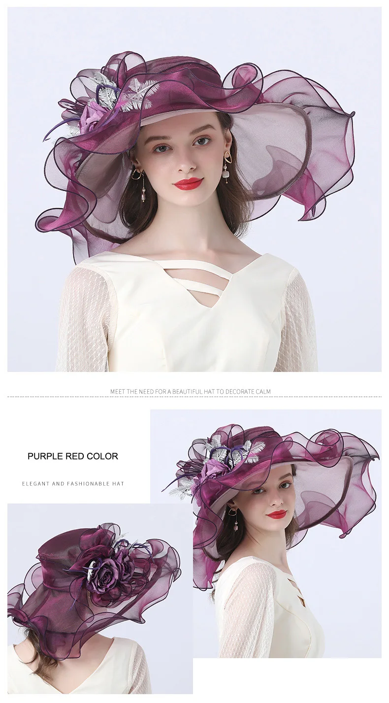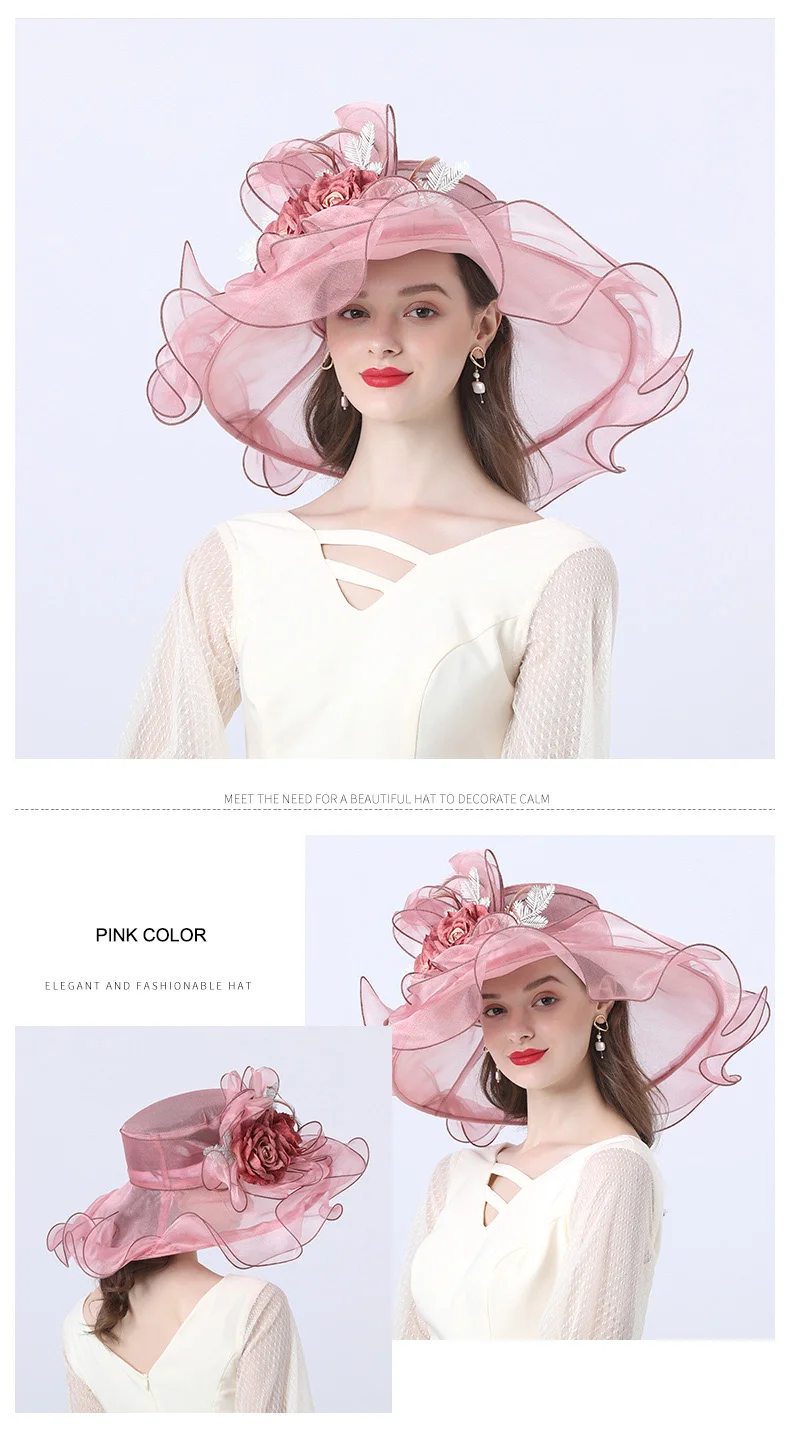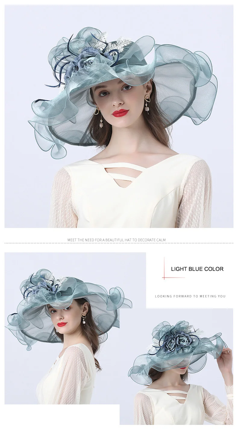 FS Flower Fascinator Women Kentucky Derby Wide Brim Wedding Church Organza Sun Hat 2021 Elegant Summer Large Ladies Fedoras