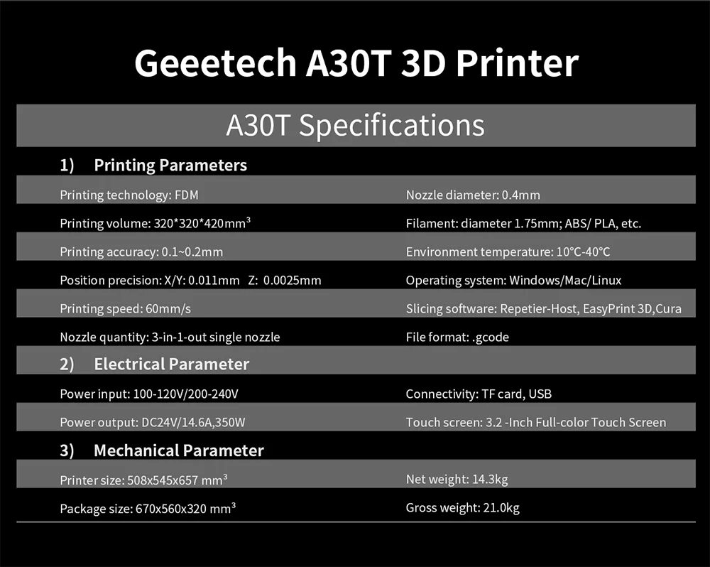 3.Large printing range: With its printing surface of 320*320*420mm, the A30T offers the best building platform and high print details.