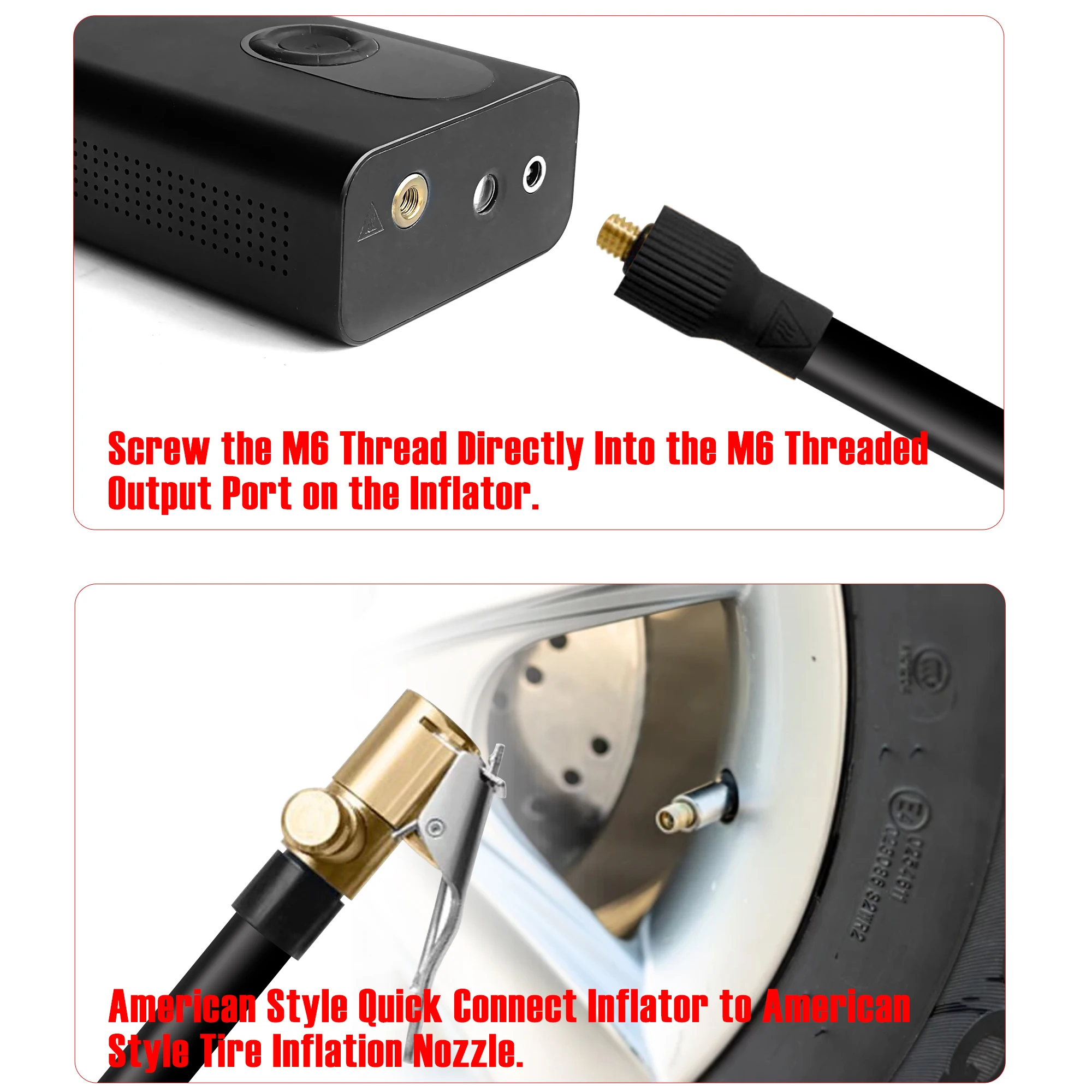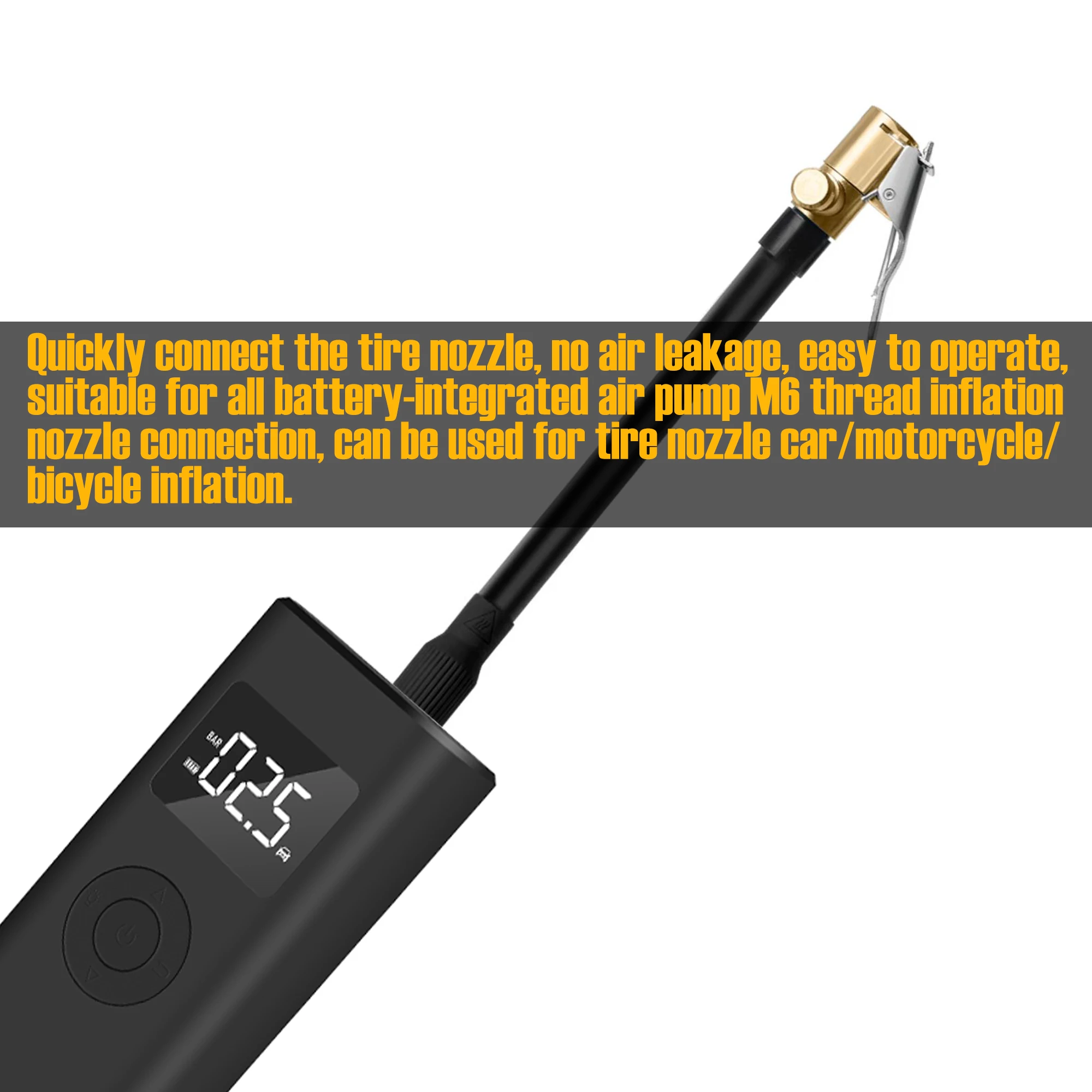 4. Quickly connect the tire nozzle, no air leakage, easy to operate, suitable for all battery-integrated air pump M6 thread inflation nozzle connection, can be used for tire nozzle car/motorcycle/bicycle inflation.