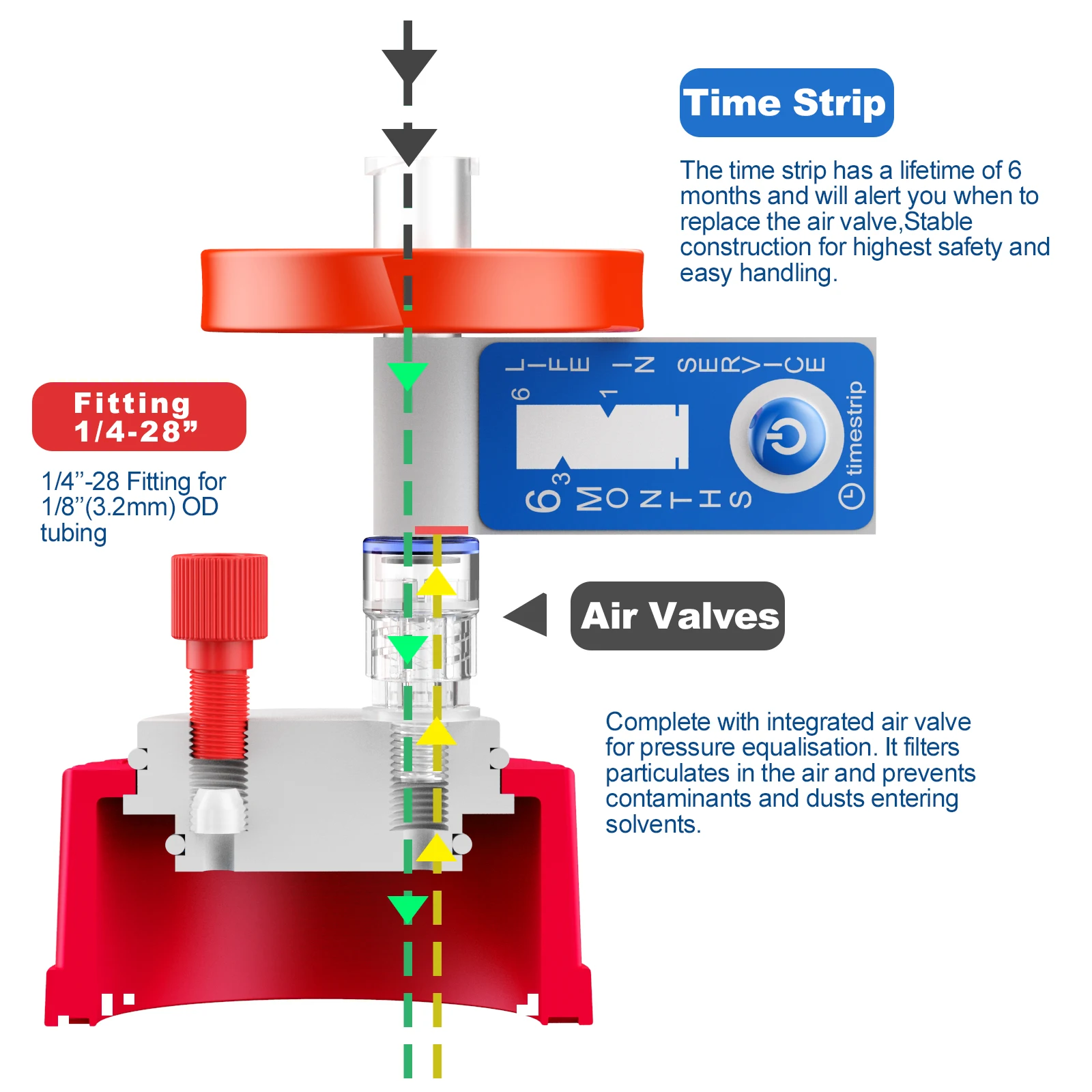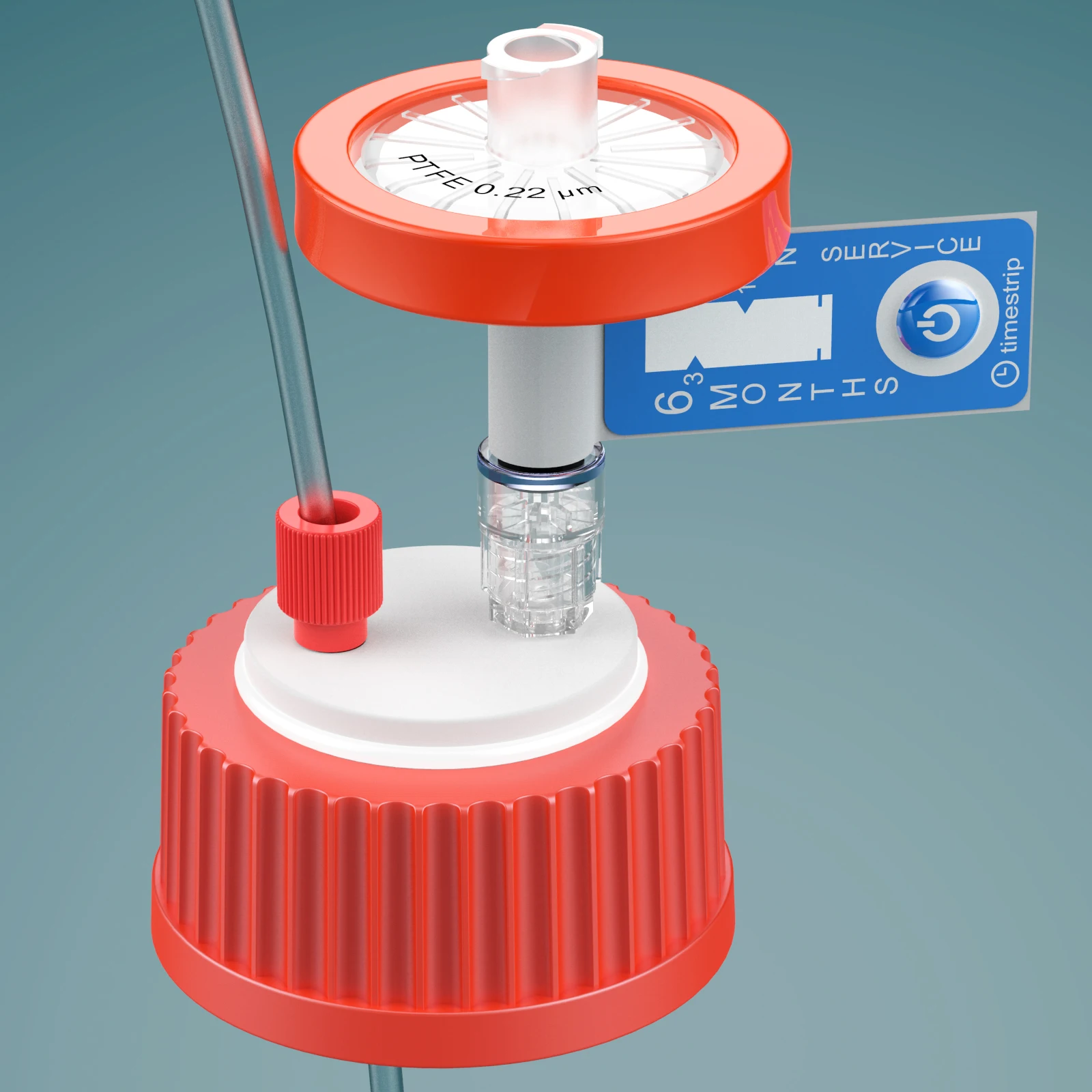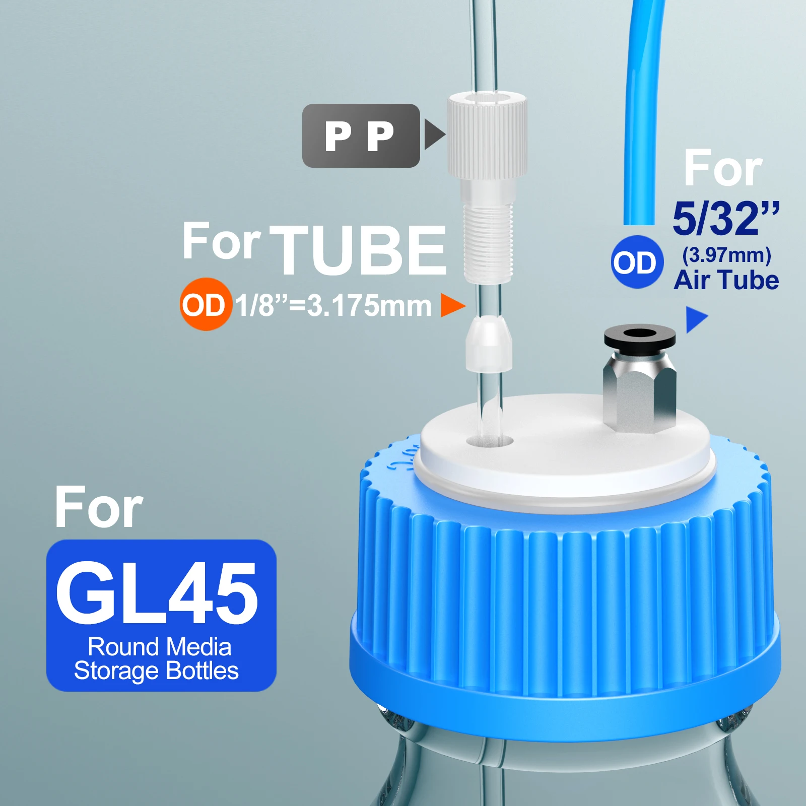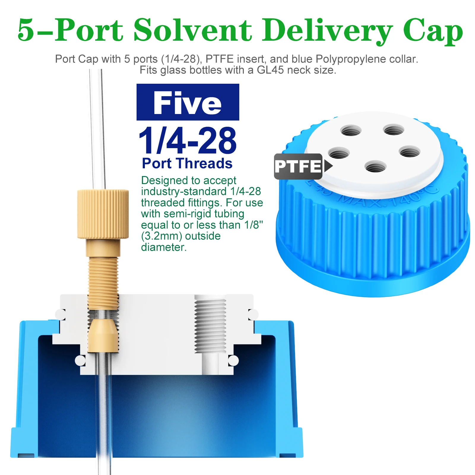Create a closed system with GL-45 safety port caps, which seal to a bottle with a secure Silicone O-ring resistant to common HPLC solvents. This cap helps avoid twisted tubing due to its free-spinning collar design. For a closed system, use the adapter with 1/8" OD tubing to seal one port and a vent filter in the other to allow for pressure changes and off-gassing.