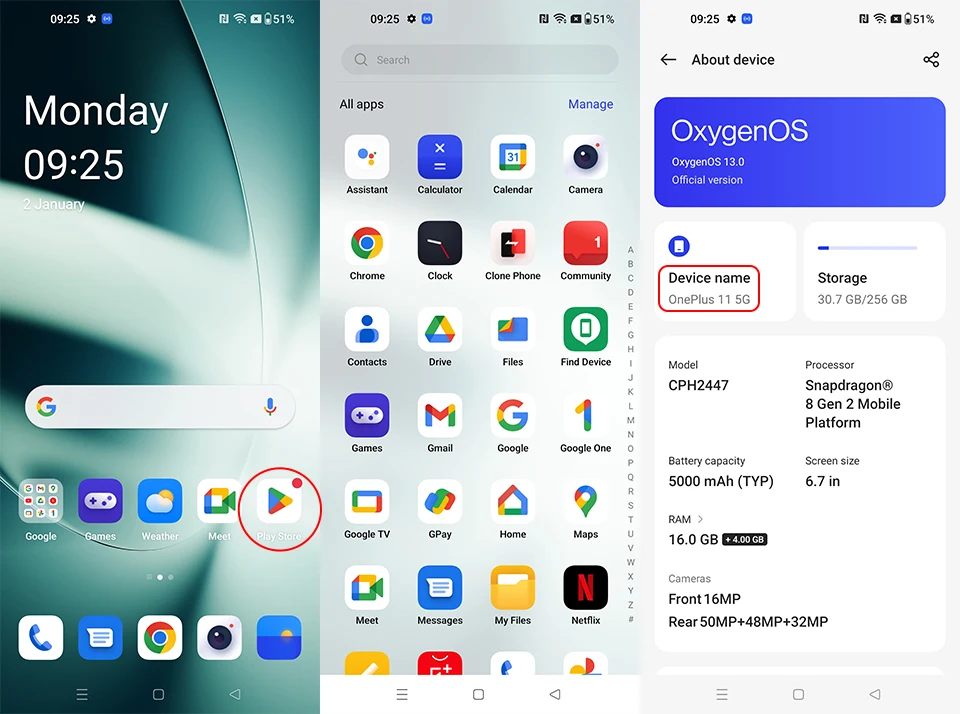 >OS --- ColorOS 13 Base on Android 13 (Global rom),Support Multi-Language & OTA Update,Google play store (After flash Global rom on it, the Google Pay, Call recording, NFC and Netflixdoesn't work.)