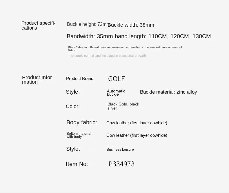 Buckle height: 72mm Buckle width: 38mm Belt width: 35mm Belt length: 110CM, 120CM, 130CM