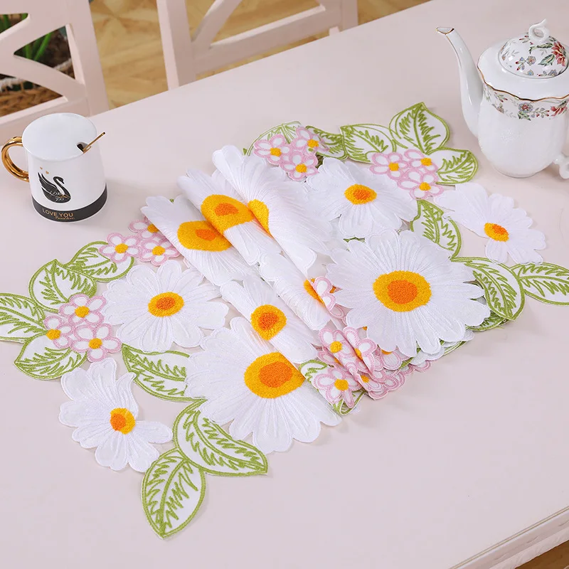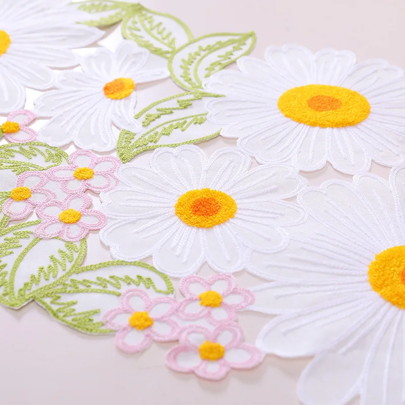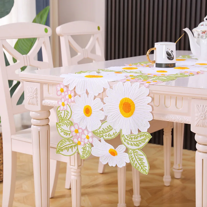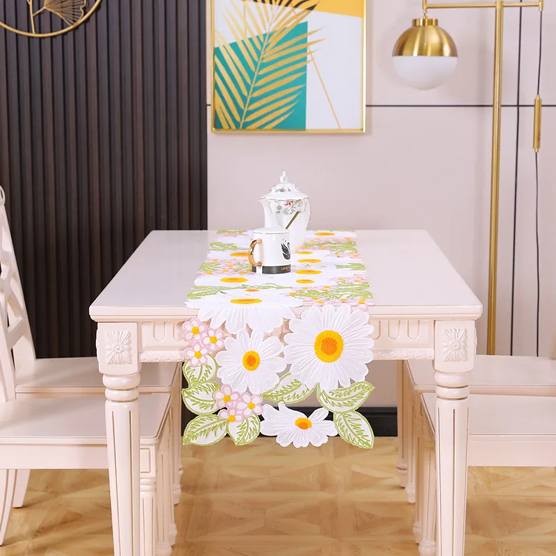 Hand Embroidery White Daisy Flower Table Runner Cotton Linen Wedding Party Dining Table Runner Placemat Home Kitchen Table Decor