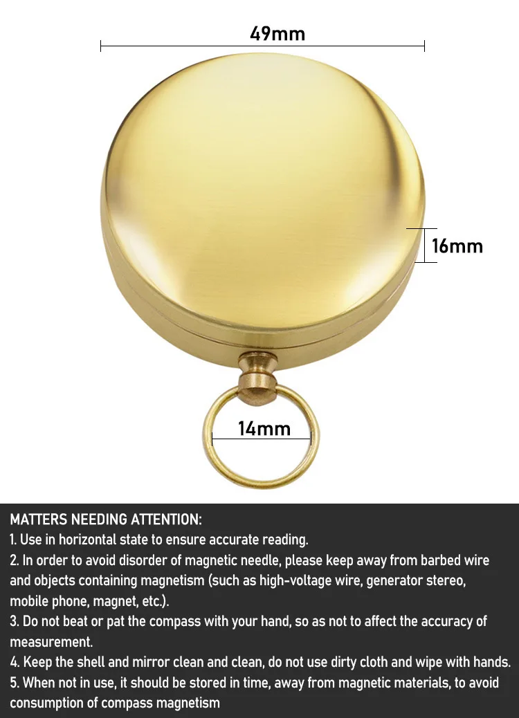 Features: Made of brass, classic fashion pocket watch shape, flip cover, waterproof, 360-degree rotating compass, with metal hanging ring, this compass has luminous function after light exposure, built-in damping oil working temperature -20℃ to 50℃. (The V-shaped notch on the flip cover is the opening force point, specially designed to facilitate opening the cover.)
