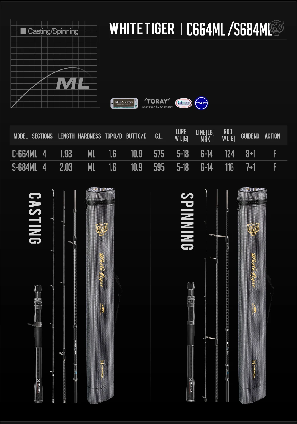 SECTIONS | LENGTH | HARDNESS | TOP O/D | BUTT O/D | C.L. | LURE WT.(G) | LINE(LB) MAX | ROD WT.(G) | GUIDE NO. | ACTION | |