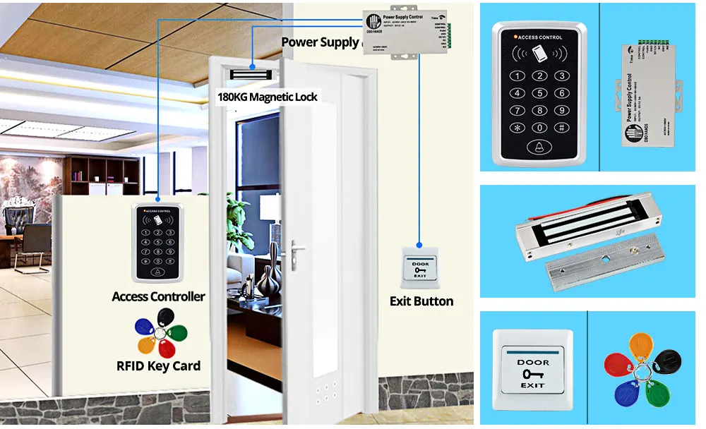 Package including: Access Control keypad + Power supply + 180KG Electric Magnetic Lock + Exit button + 10pcs Keyfobs