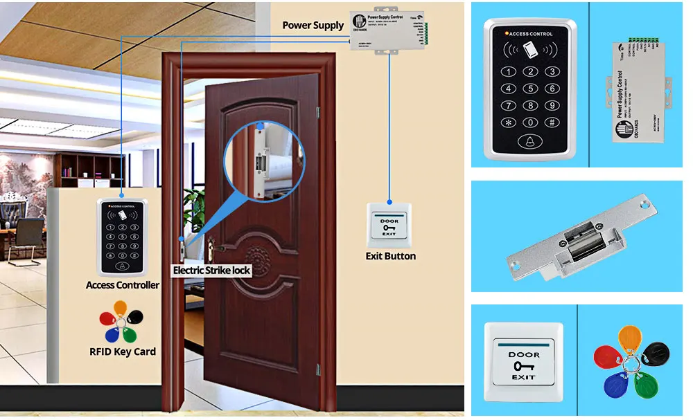 Package including: Access Control keypad + Power supply + Electric Strike lock + Exit button + 10pcs Keyfobs.