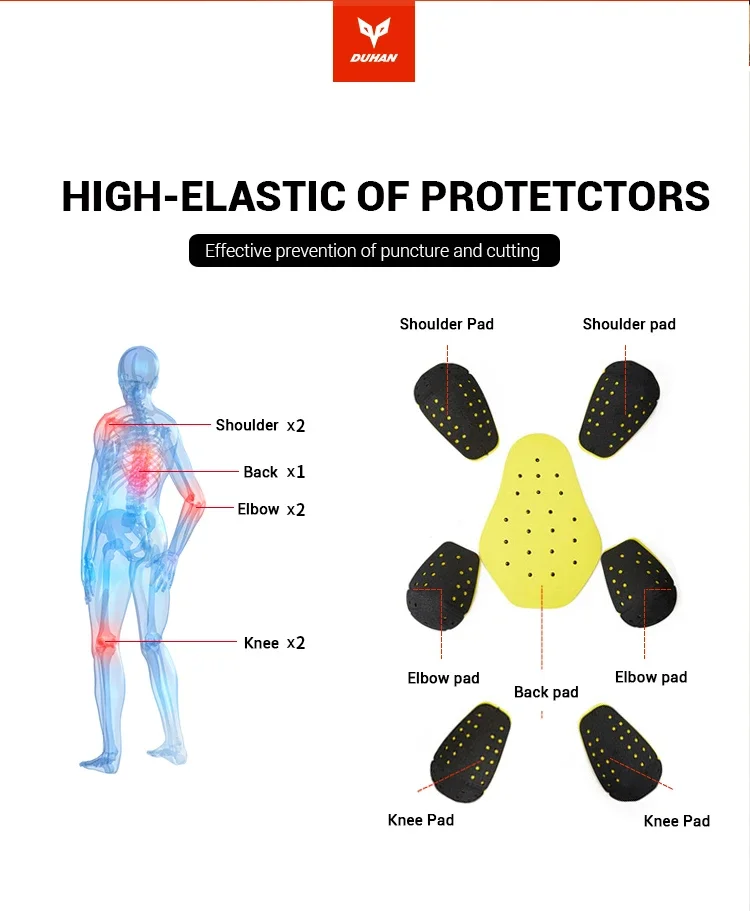 Removable 7 pieces EVA protectors on the back, shoulders, elbows and knee