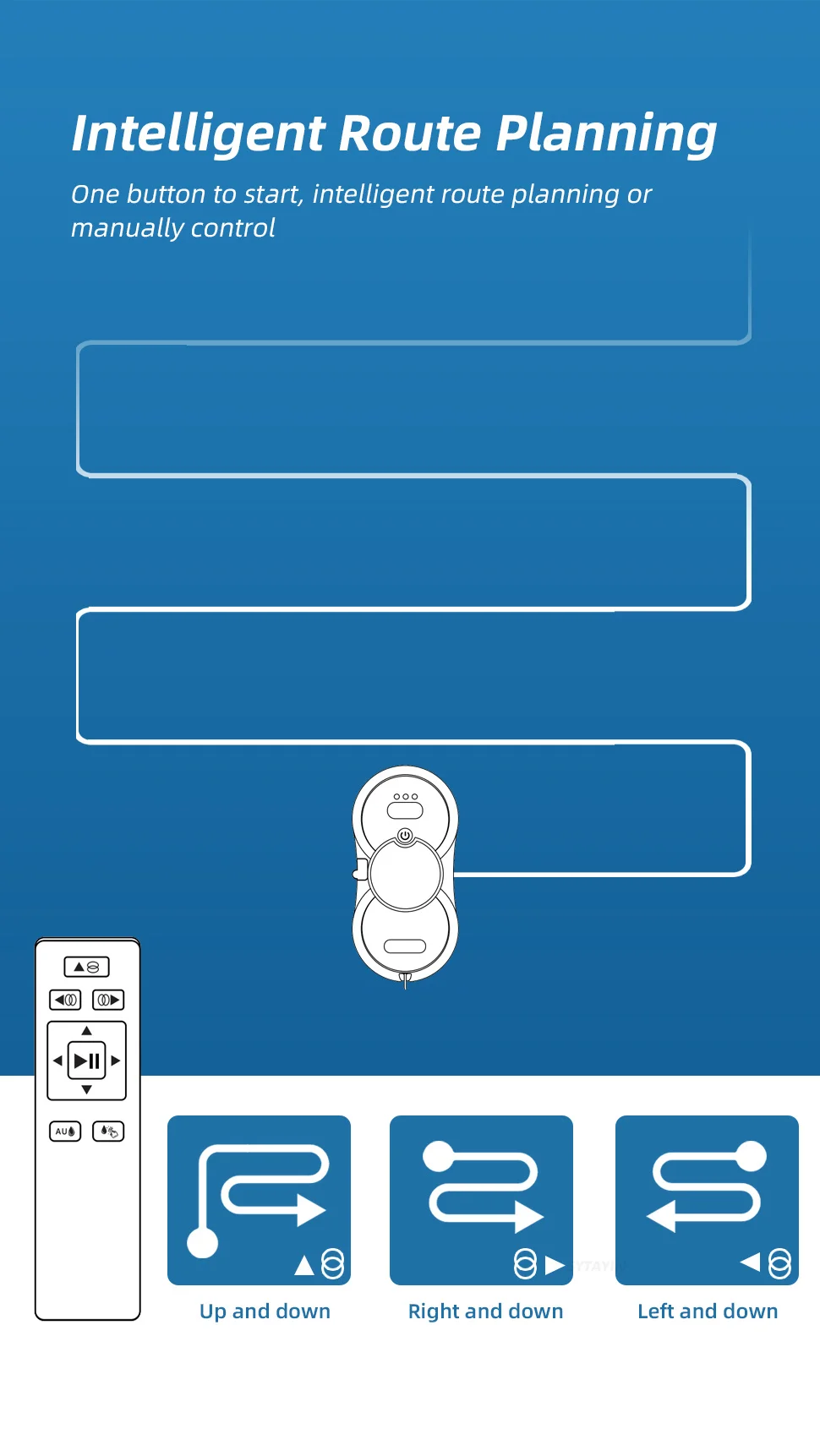 One button to start, intelligent route planning or manually control (Up & Down|Right & Down|Left & Down)