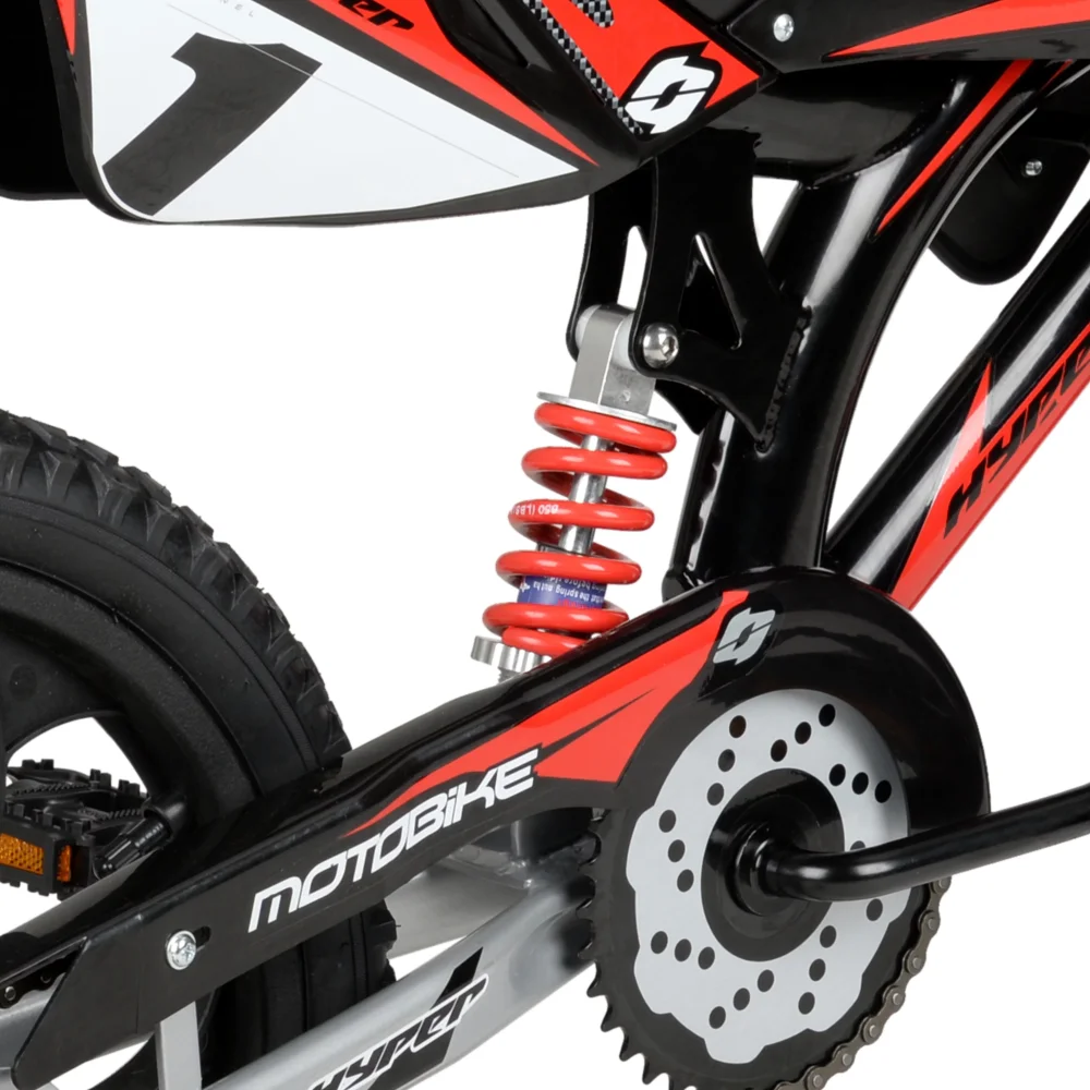 The Hyper Mag Wheel Motobike is the unforgettable children's bicycle. With hi-impact mag wheels, authentic Hyper graphics, fenders, and a cool superbike-style saddle, this is the coolest kids bike to hit the streets. It's built with a sturdy steel over-sized frame, steel handlebar, 16-inch rims, removable training wheels, and knobby tires. Standard size pedals and front brakes ensure an easy way to stop. Being a single speed bike, there are no complicated gears to maintain or untangle. It's easy to assemble and has a max rider weight of 100 pounds. It's fully loaded with everything they'll need to get around safe and in style.