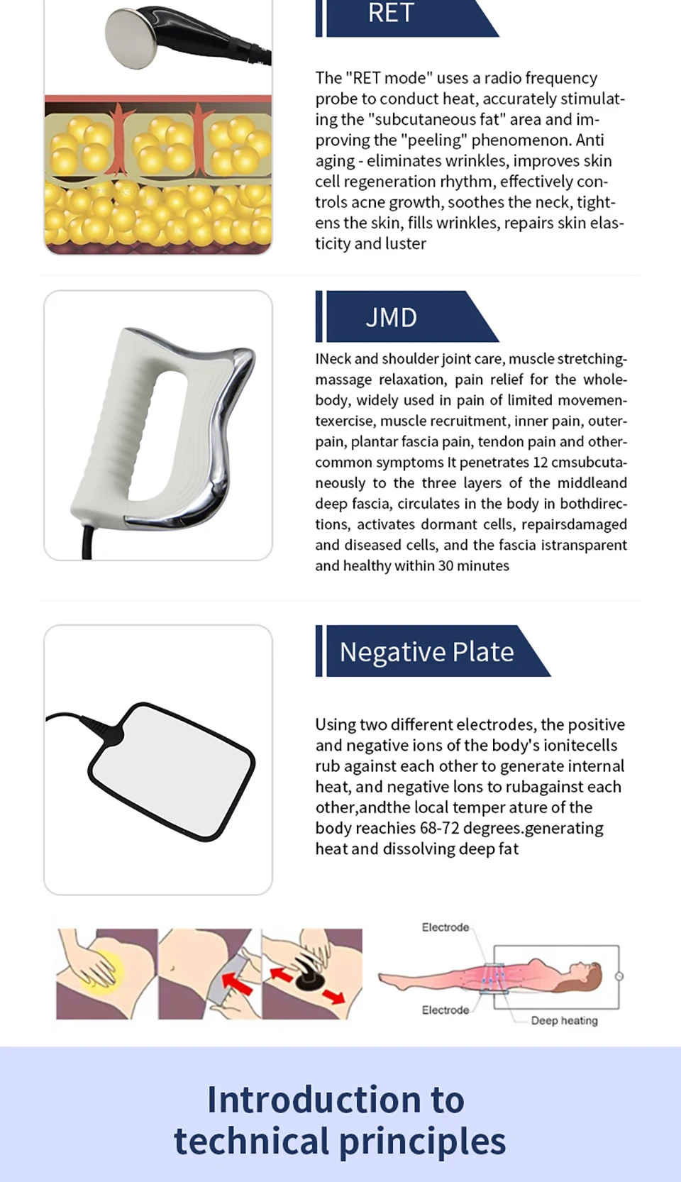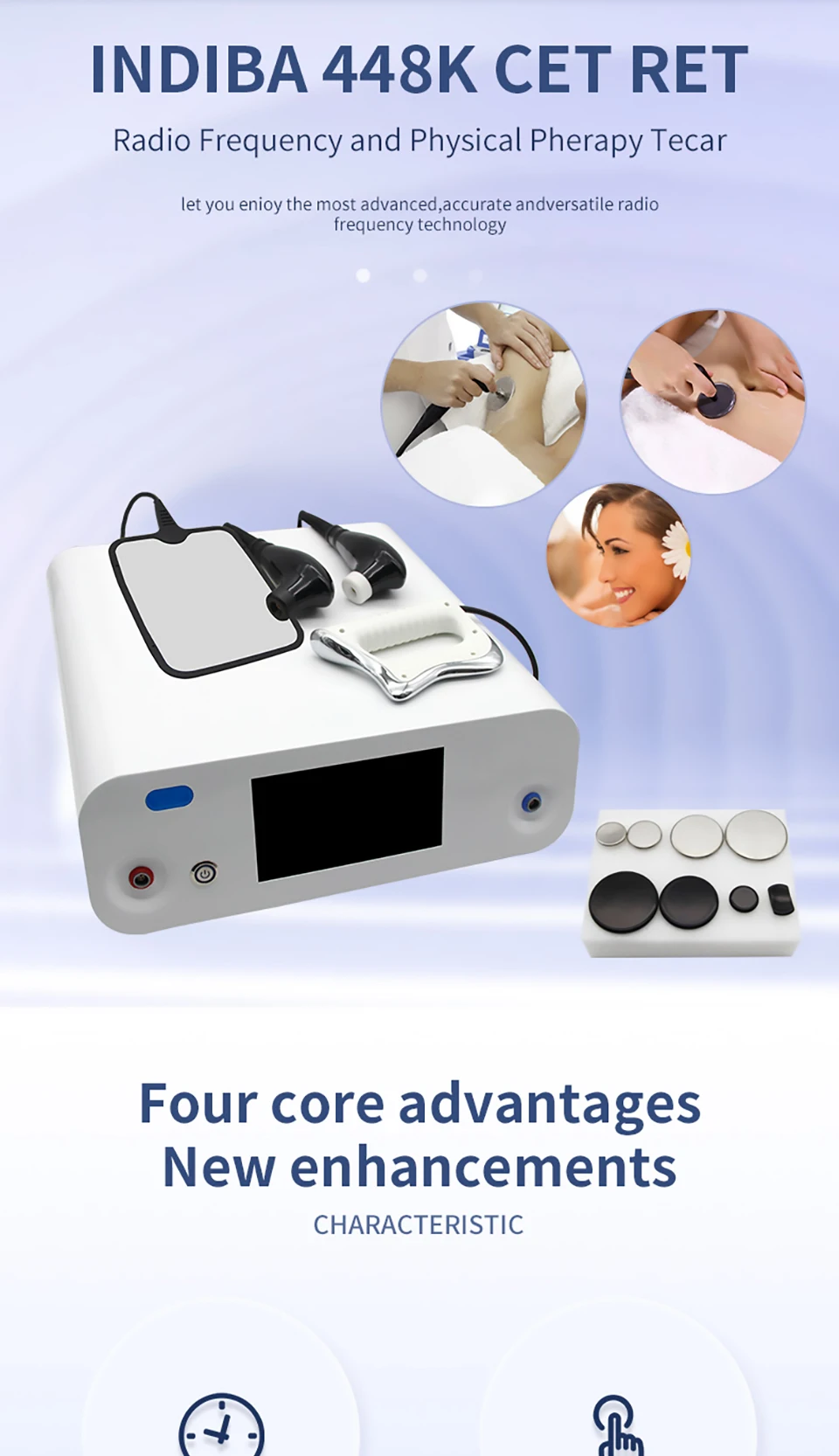 The 448k thermocontroller can safely deliver energy to the deep parts of the body through the high weekly wave of 448KHZ, improving the internal temperature and immunity of the body.