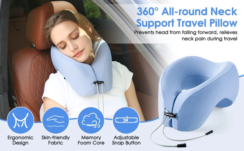 【High Quality Memory Foam】Our Memory Foam Travel Neck U Shaped Pillow is constructed with high quality 5-second rebound memory foam. Its slow rebound helps absorb pressure and shape into the position that is most desirable for you. More importantly, the pressure at the contact points of the head, neck and shoulders will be evenly distributed, and the neck pillow will recover quickly after the pressure is released.