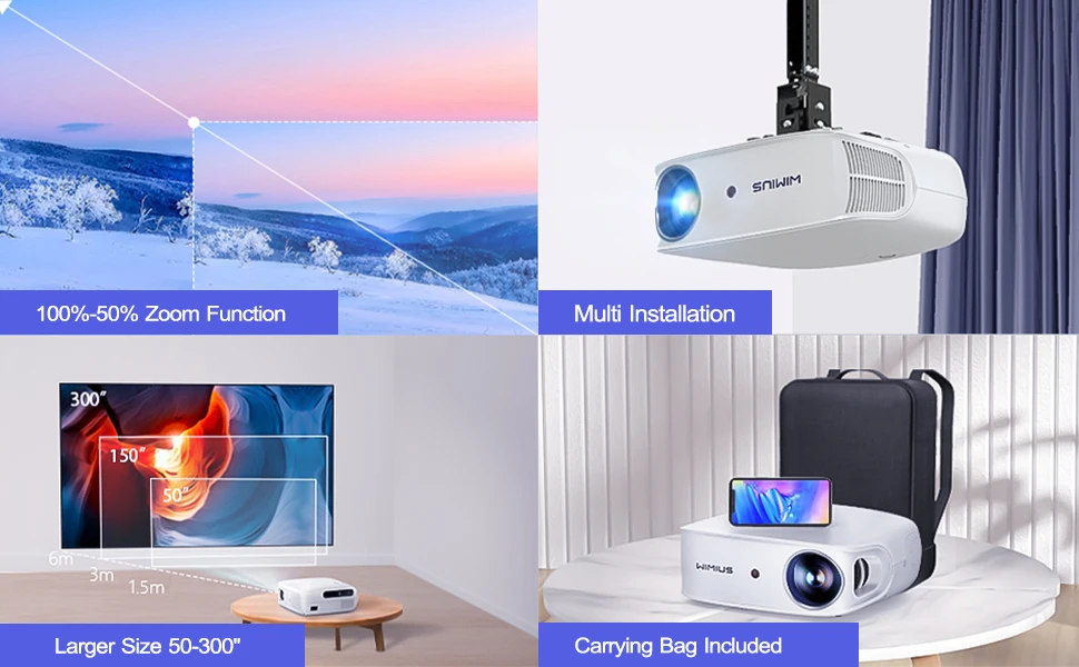 ⚽【500'' Giant Display &Zoom Function & Wide Compatible Application】WiMiUS K7 4K projector can project larger image between 50-500 inches. It has 100%-70% zoom out function to shrink the image. To shrink the image, no need to move the projector. This home cinema projector has HDMI, AV, USB and 3.5 mm audio output interfaces, perfect for playing videos, TV shows, games, concerts, etc.
