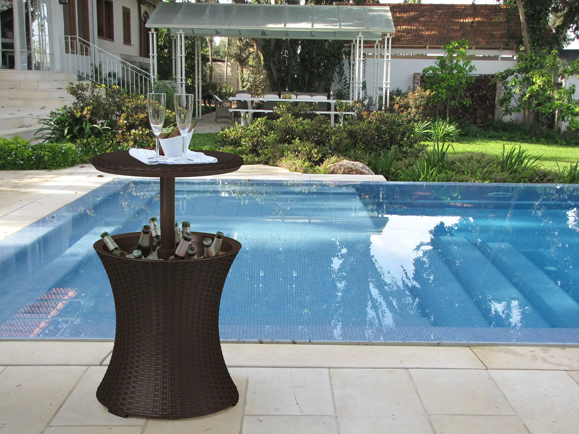 Keter Pacific 7.5 Gallon Cool Bar , Resin Outdoor Patio Beverage Cooler Table, Extra Storage, Rattan Look Brown. The top rises smoothly from 22.5 inches to 33.2 inches in overall height and locks into place to prevent it from falling when topped with food and drinks!
