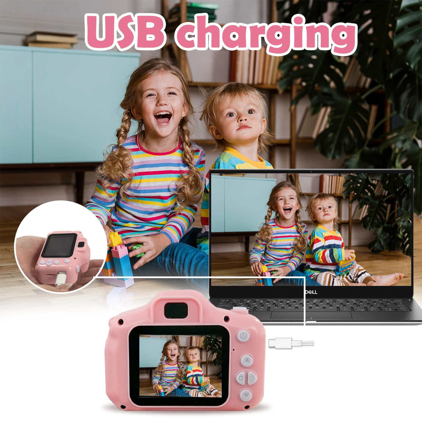 The children's camera is equipped with a USB data cable, which can charge the camera.