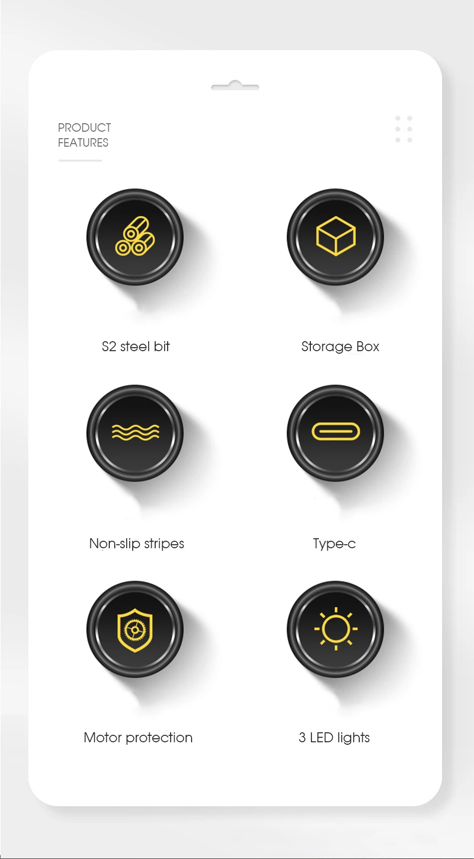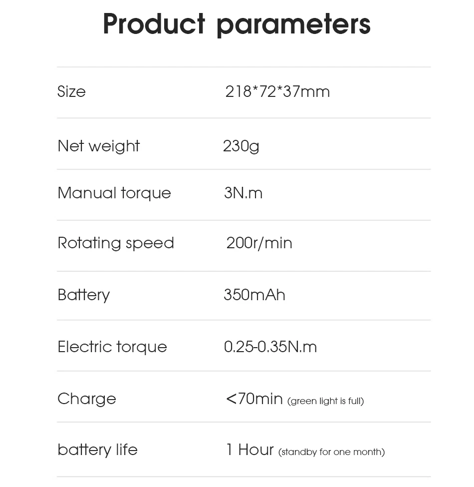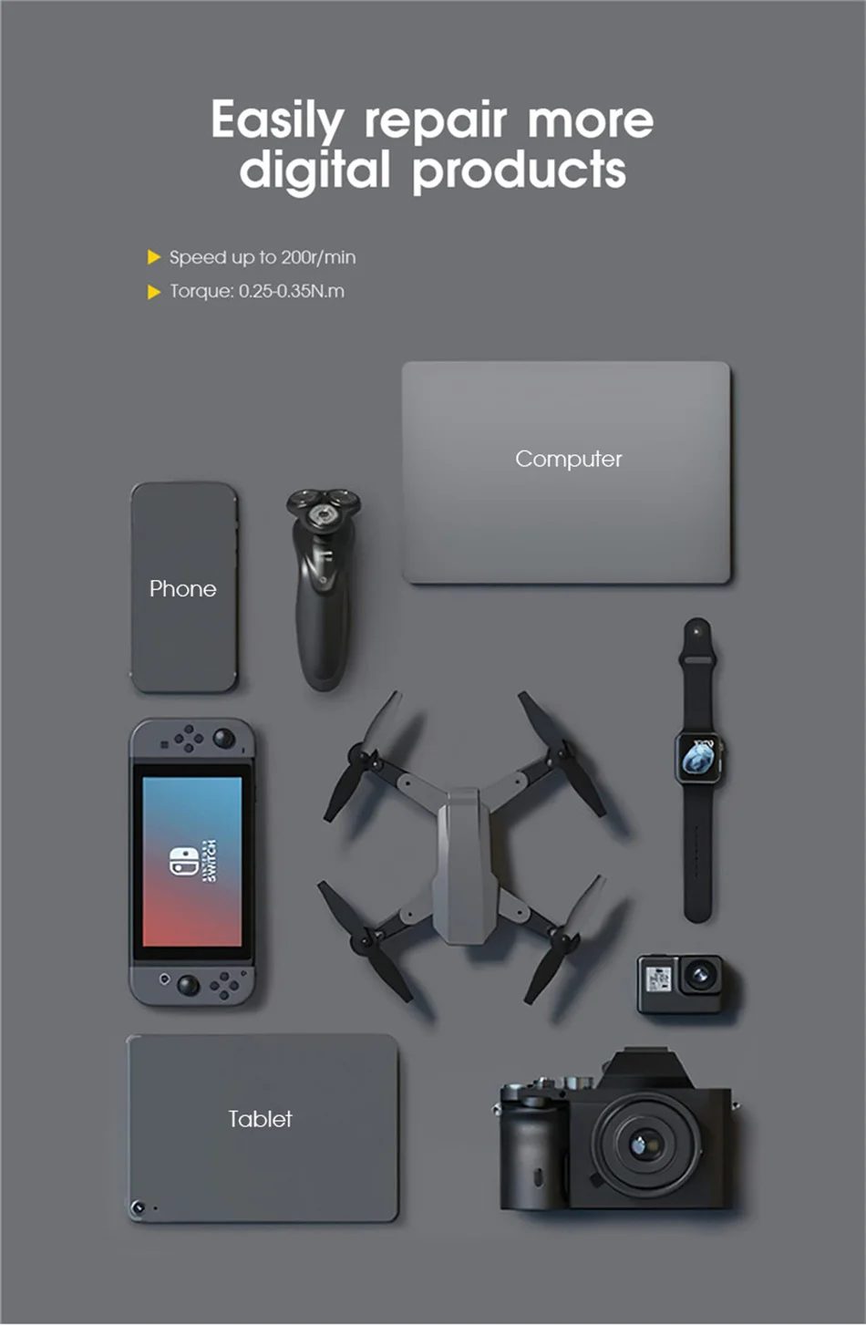 1. Easily repair more digital products. The maximum speed can reach 200rpm. Torque: 0.25-0.35N.M.