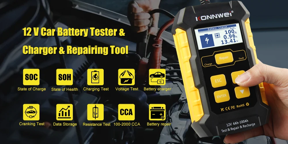 1.【12 V battery tester: Konnwei KW600 is a professional and improved battery analyzer for car owners / mechanics to read all 12 V battery data including voltage, internal resistance, cold start amplifier and AH capacity, charge status, health status. Even a beginner can easily analyse the battery.