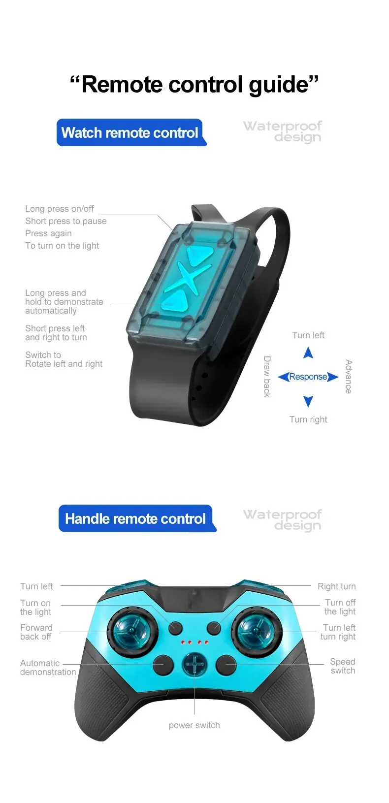 360 ° rotation and 180 ° reverse: This waterproof remote control can rotate 360 °, turn left and right, and then flip 180 °.
