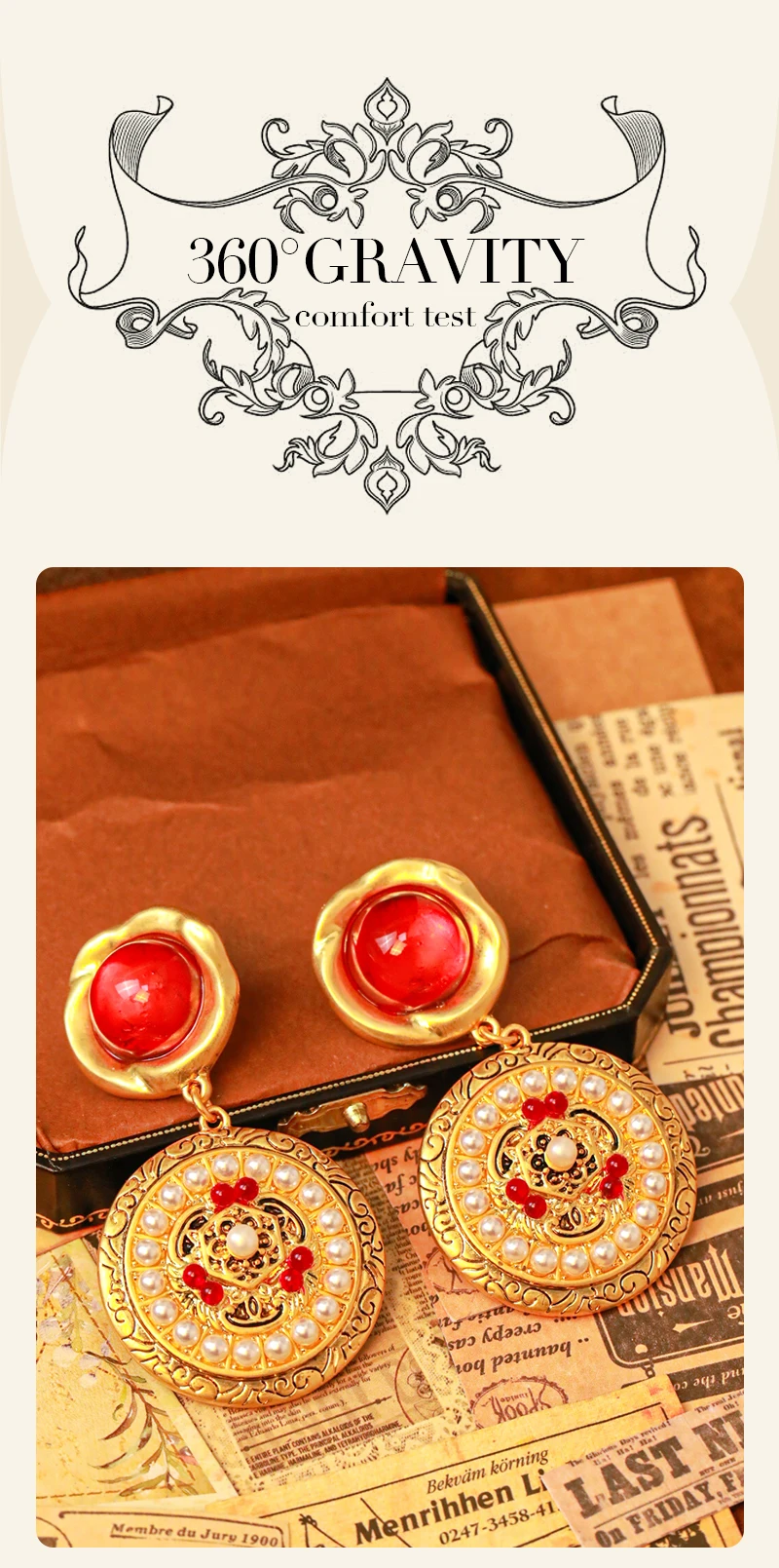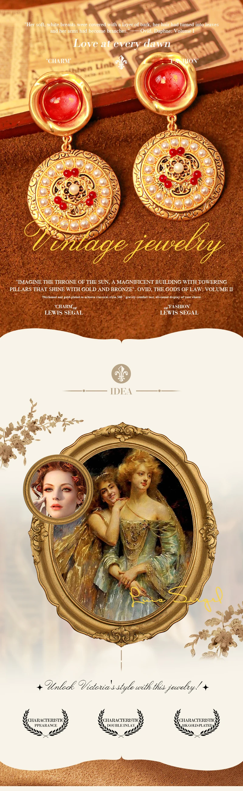 LEWIS SEGAL Small Ruby Dangle Earrings with Pearls for Women Medieval Style Elegant Party Fine Jewelry Round 18K Gold Plated