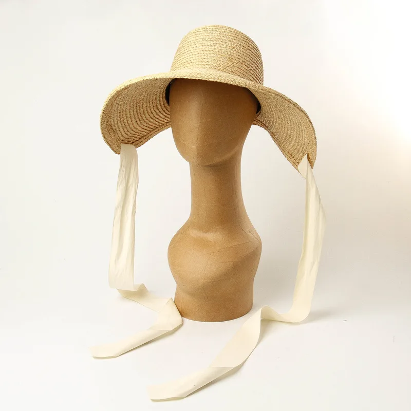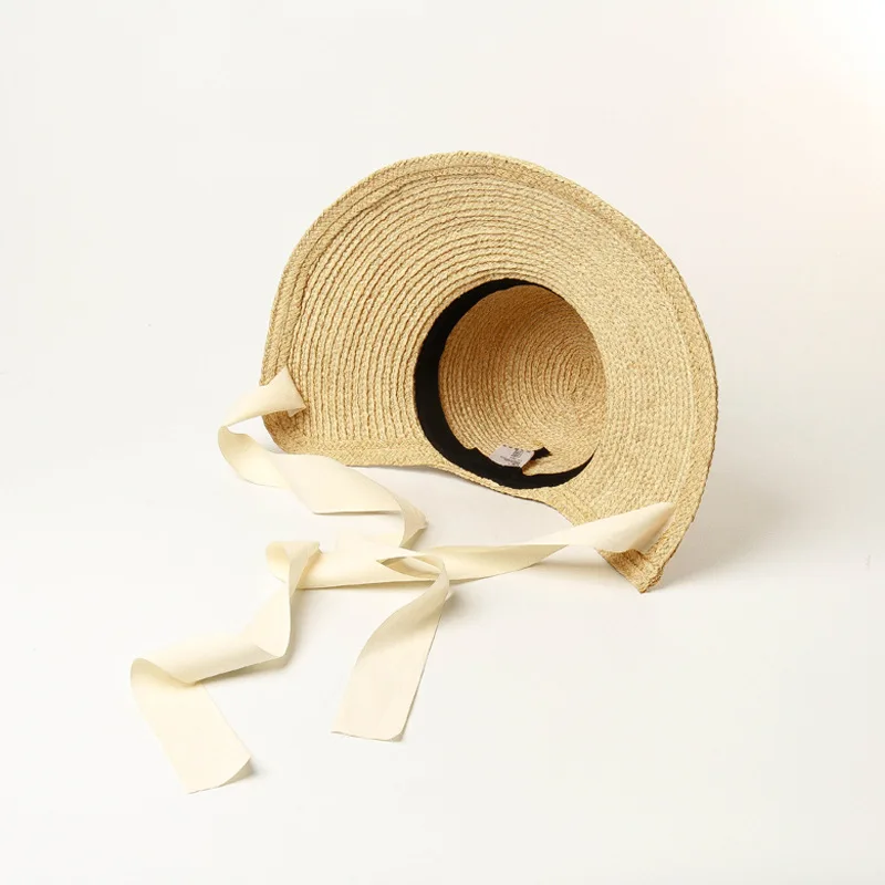 Choose Options Quick view Spring and summer new flat-top curved big brim with straps hand-woven raffia straw hat outdoor travel beach straw hat $104.71 Material: raffiaSize: head circumference 56.5cm adjustable sweat bandHat height: about 10cm, brim: about 19cm