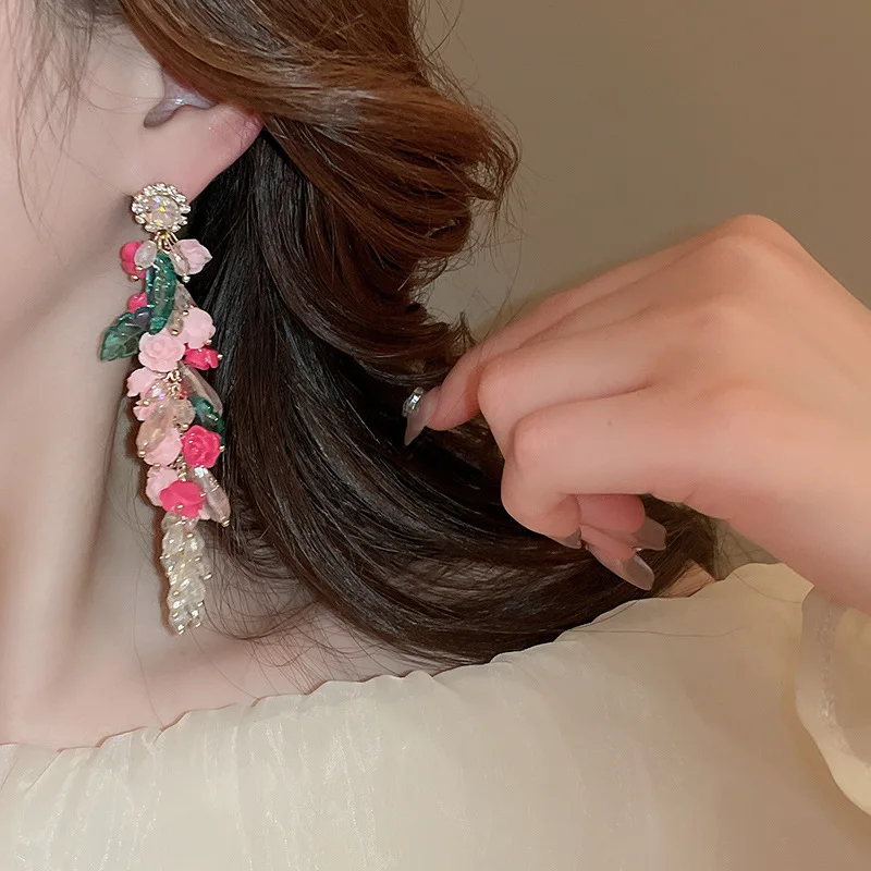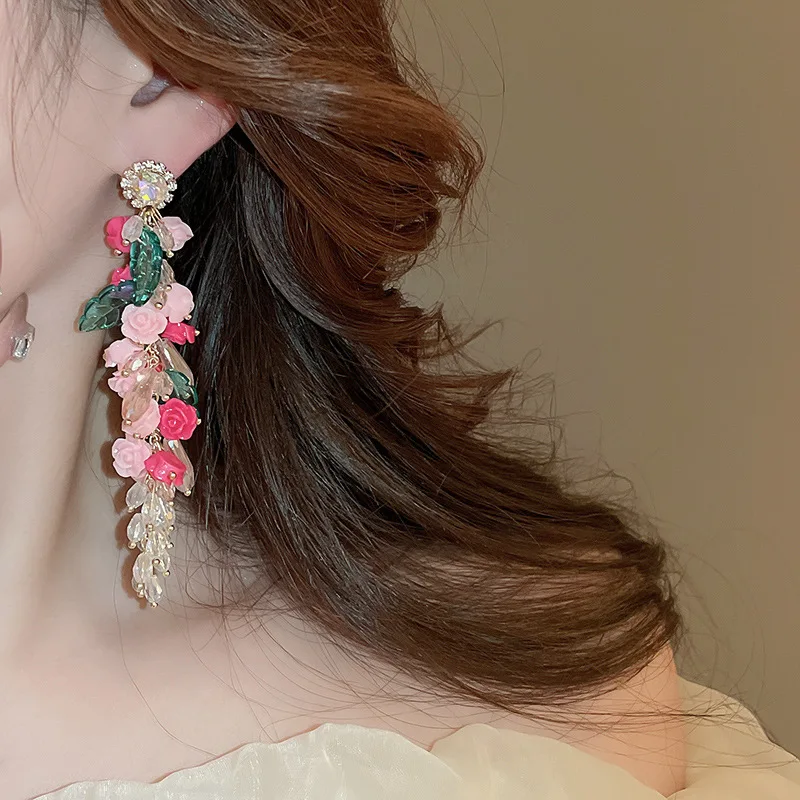 Lovely Clear Flower Earrings Long Tassel Personality Korean Style Lucky Women Jewelry Pink Style Accessories Earrings