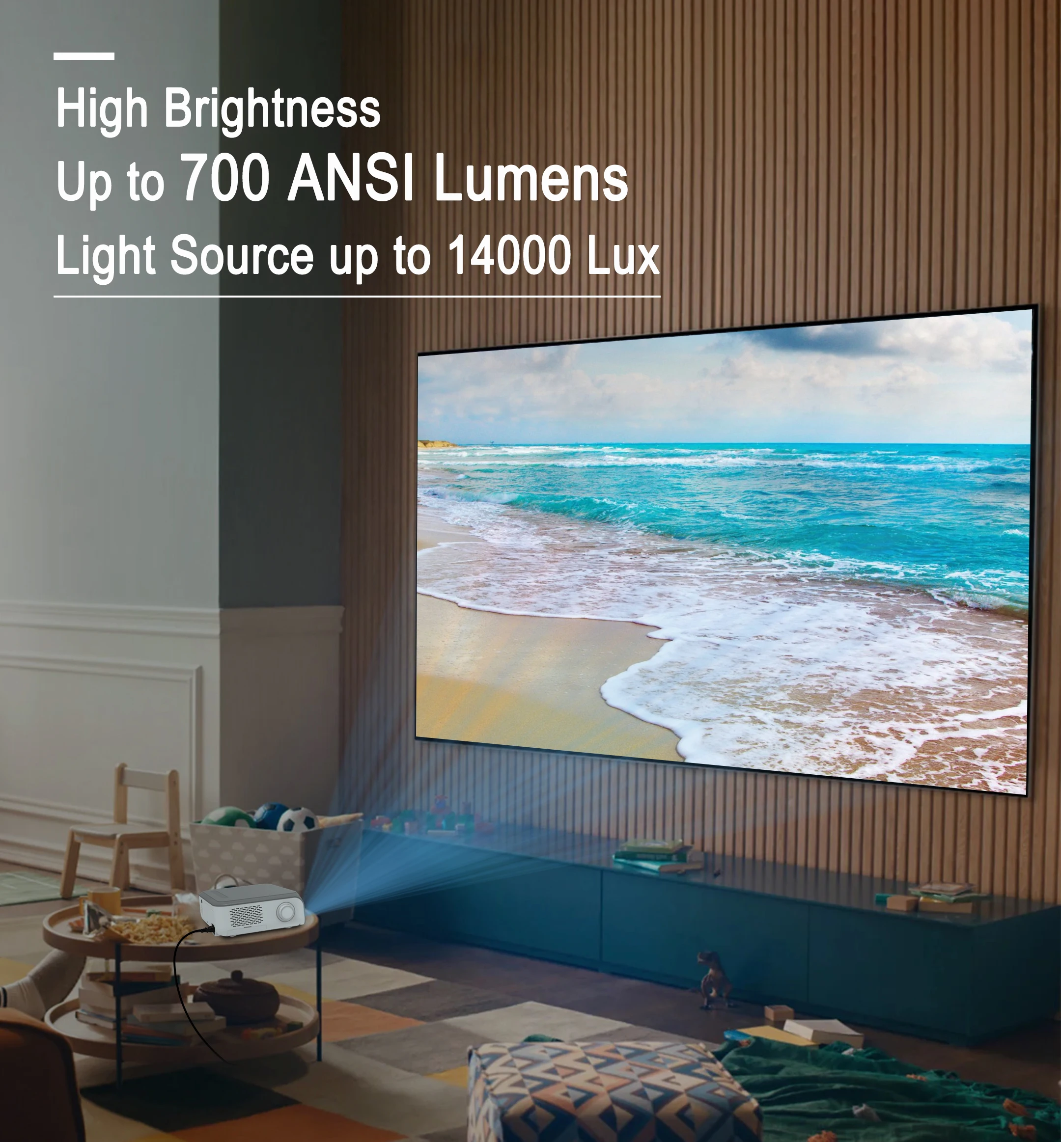 *MECOOL KP1 with a native resolution of 1920x1080P and remarkable 700 ANSI Lumens brightness, provides sharp and detailed images and provides you with an immersive home cinema experience.