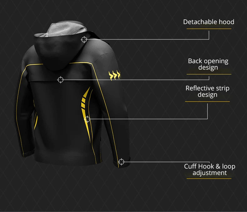 Double entrance front pockets. The front zipper has a snap-button windproof cover, the rear cloak is ventilated, and the hood is retractable. Noise-free and comfortable fabric, convenient for exercise, underarm and back vents help you keep cool